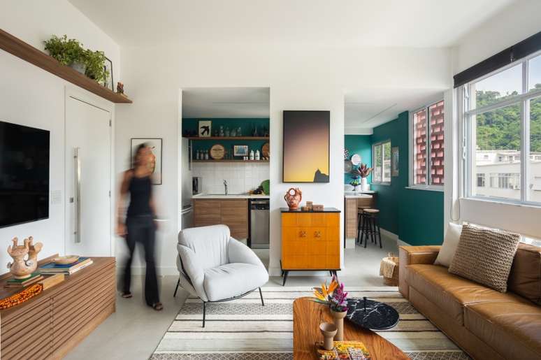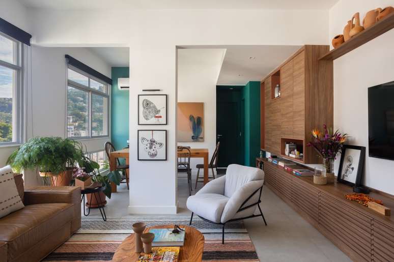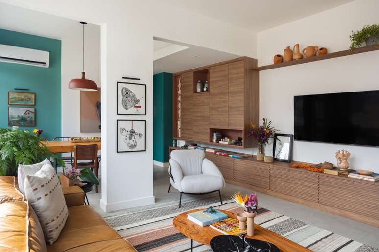 Já o acabamento madeirado dos armários da cozinha foi replicado na marcenaria que se estende em toda parede da tv, na sala. Para "aquecer" e trazer acolhimento, o sofá ganhou estofamento em couro natural e a maioria dos móveis são de madeira.