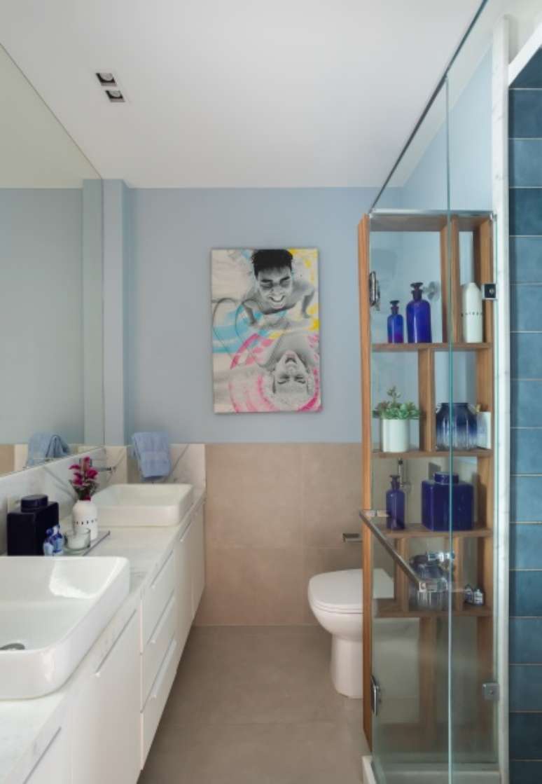 "Desde o início, os clientes delimitaram um orçamento para este projeto projeto e por isso buscamos soluções para baratear a reforma, como revestir os banheiros até meia parede, com exceção do box com chuveiro, revestido do chão ao teto. Pelo mesmo motivo, algumas paredes da cozinha foram pintadas com tinta", conta a arquiteta Ketlein Amorim.