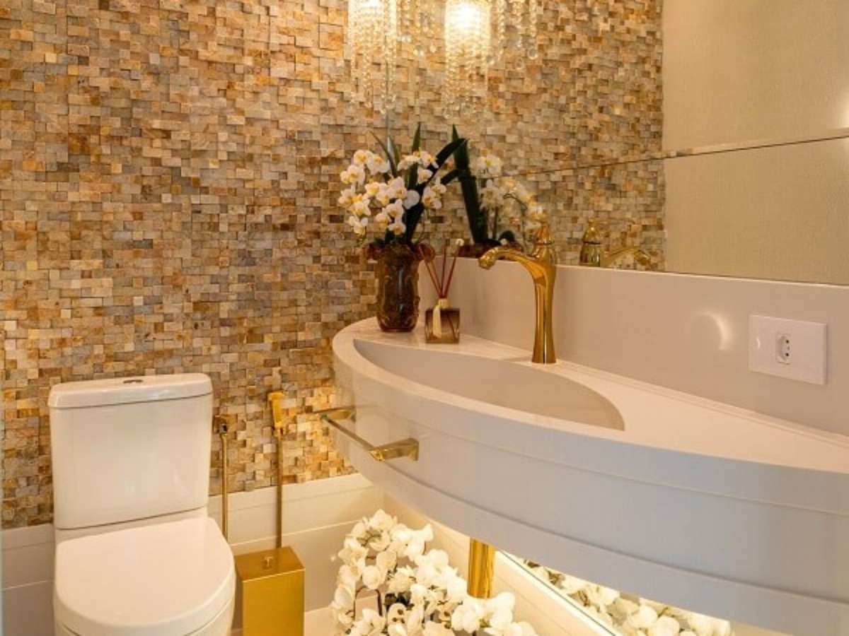 50. Banheiro chique com revestimento dourado e cinza – Foto Laura Santos