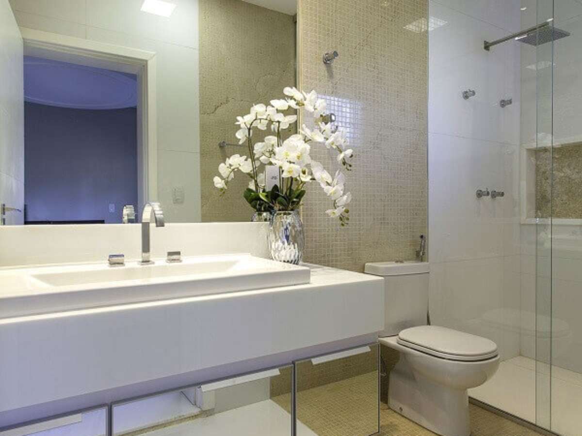A bancada da sua pia de banheiro chique pode ser feita de mármore, granito, quartzo cinza ou porcelanato. São os materiais mais resistentes e bonitos para seu projeto de banheiro chique e simples.