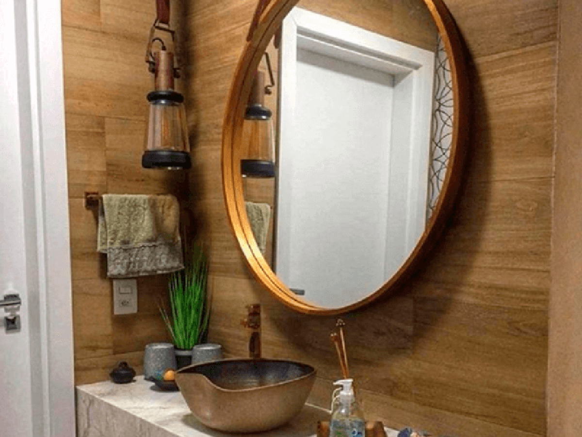 O uso do porcelanato madeira ajuda a garantir aquela atmosfera aconchegante de spa ao seu banheiro. Você pode intensificar essa ambientação adicionando luzes indiretas que, combinadas à textura amadeirada, trazem ainda mais charme para o seu banheiro.