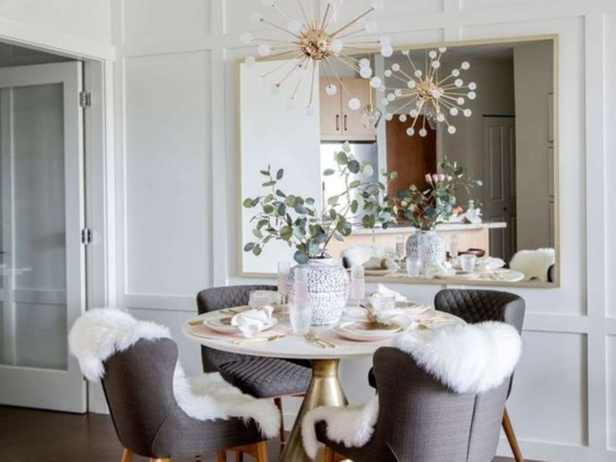 1. Decoração com base para mesa de jantar dourada e cadeiras cinza – Foto Ruemag