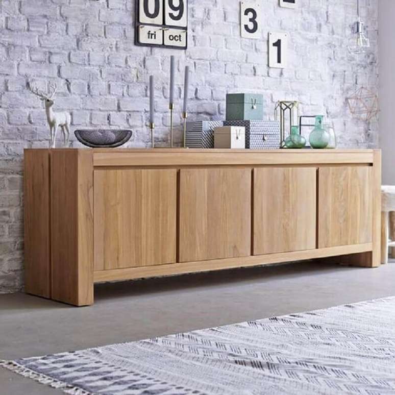 1. Buffet aparador de madeira para decoração de sala com parede rústica – Foto: Pinterest