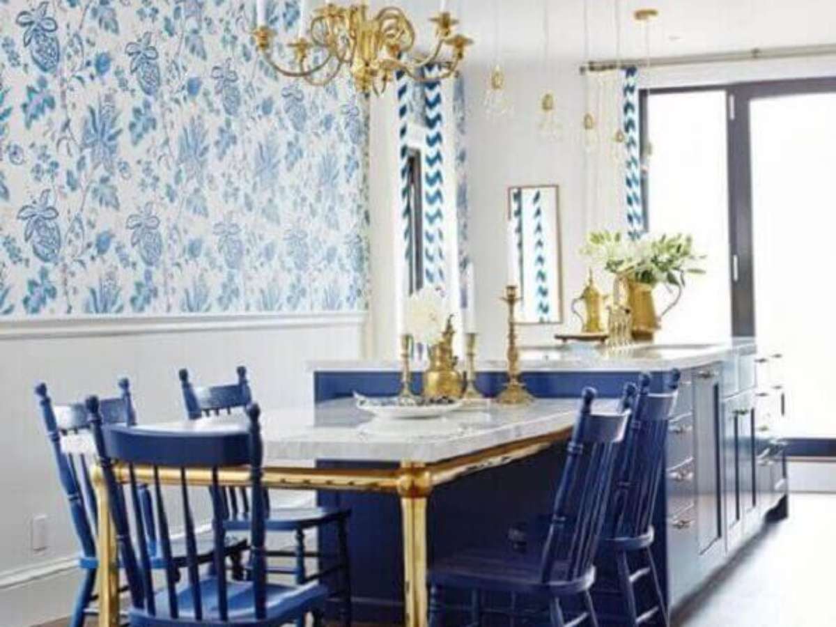 1. A cadeira azul junto com os detalhes em dourado deixou a sala de jantar clássica ainda mais sofisticada – Foto: Home Fashion Trend
