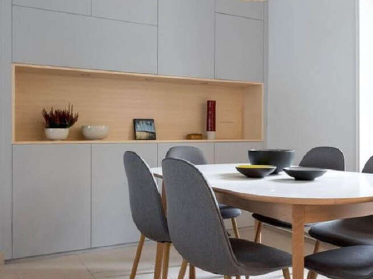 29. Decoração de cozinha planejada moderna com cadeira cinza para mesa de jantar de madeira – Foto: Behance