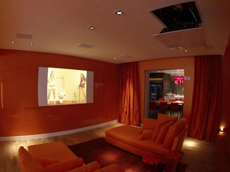 O quarto em homenagem à apresentadora Sabrina Sato une duas tendências: o color block e as TV embutidas em espelho