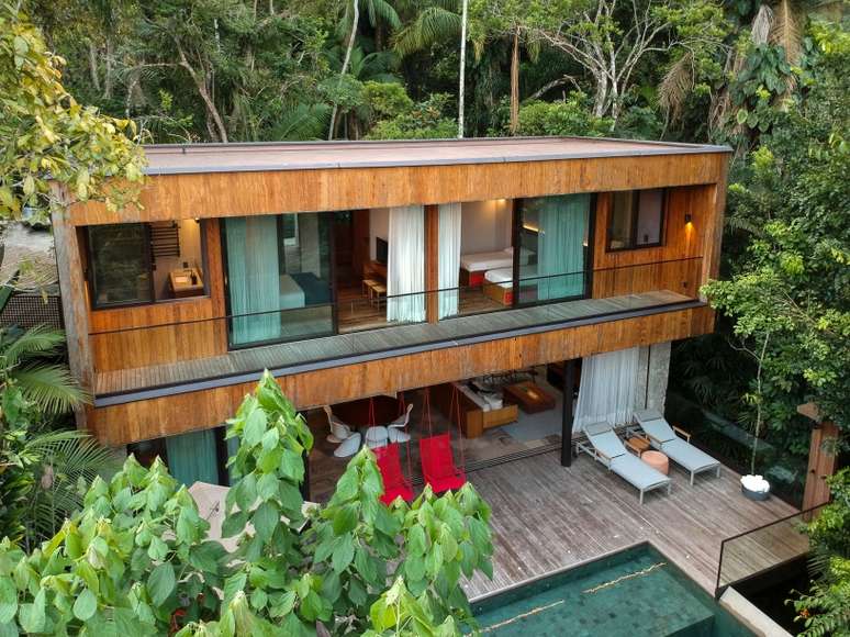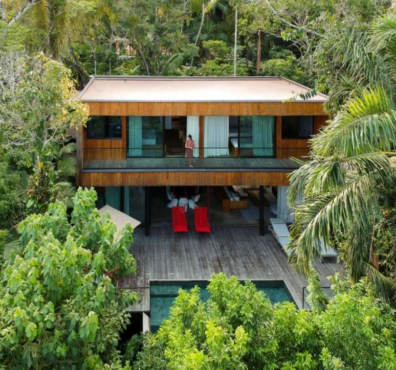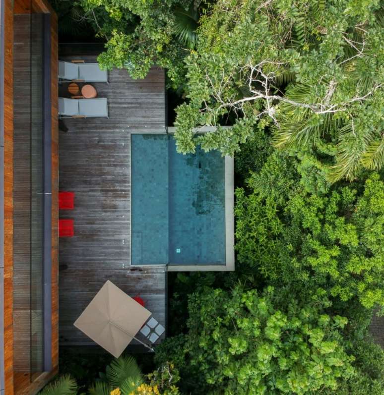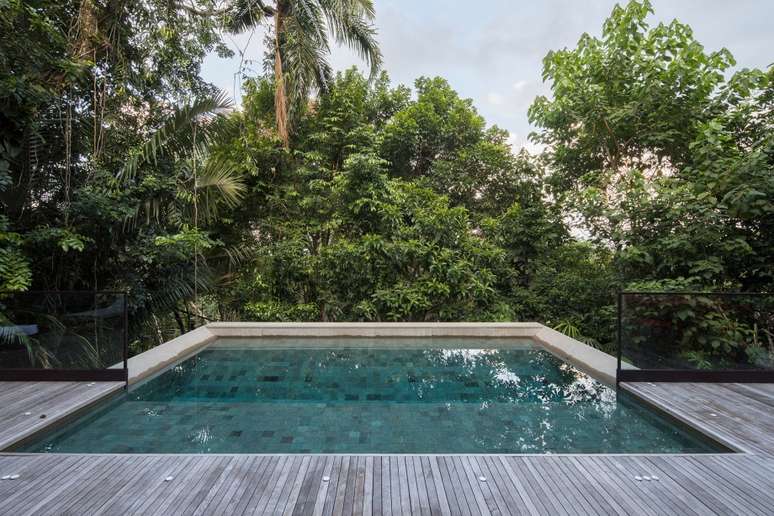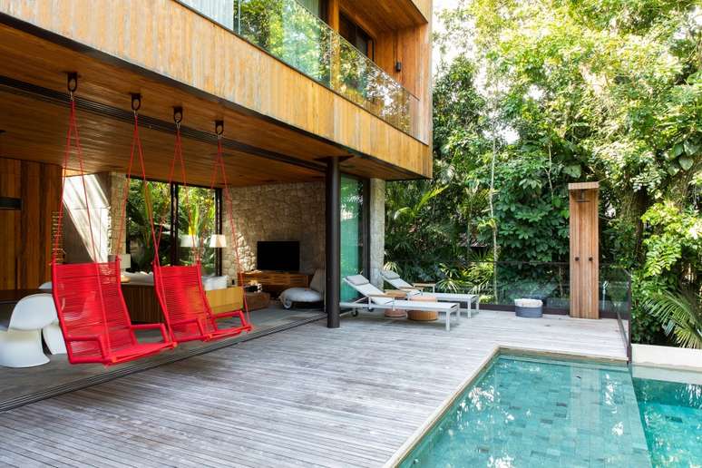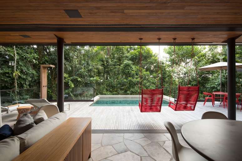 No projeto assinado por Daniel Fromer, a piscina parece flutuar no meio da mata. Os interiores são de Julyana Bortolotto