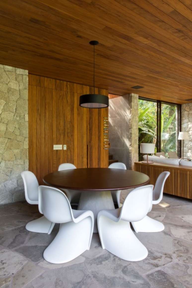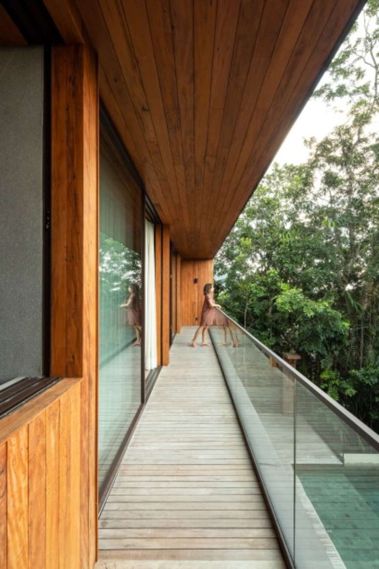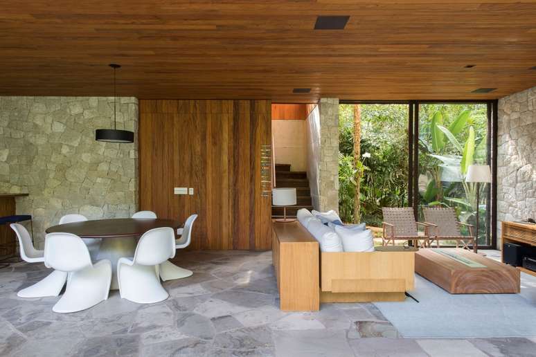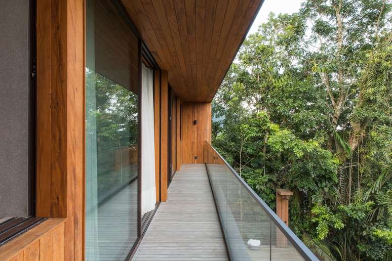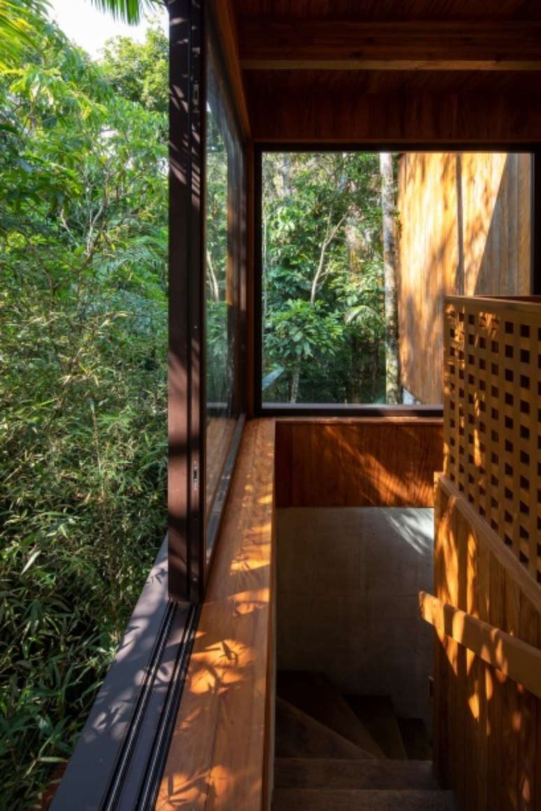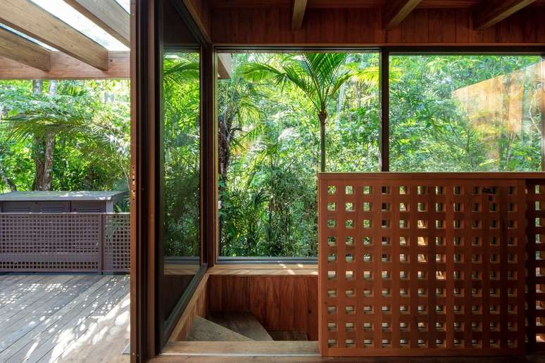 Outros detalhes tornam a casa mais incorporada à natureza, como espaços envidraçados que conectam o imóvel ao exterior verde. Aqui, a solução encontrada foi integrar ambientes como a sala-varanda, ampliar os visuais para a parte de fora, privilegiando a conexão com as grandes árvores do local e contribuindo para a sensação de tranquilidade e frescor que a proximidade à natureza oferece.