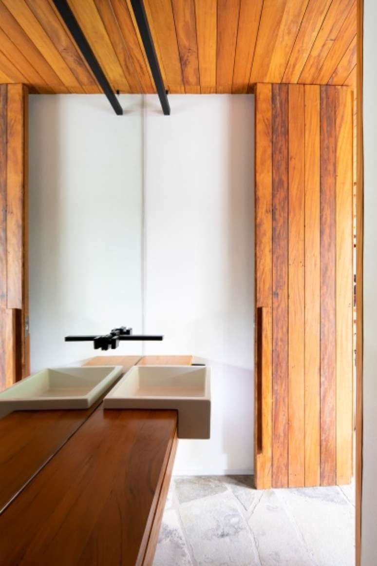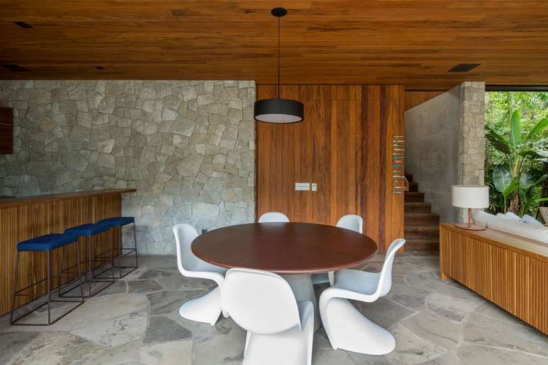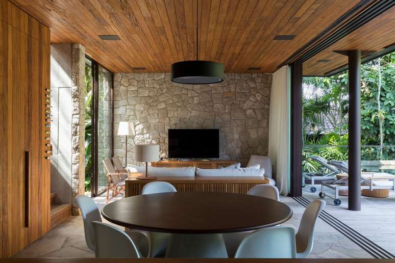 Para que a casa estivesse sempre clara, o projeto de iluminação, feito pelo escritório LUX, privilegiou a iluminação indireta refletida nos materiais que foram propostos pela arquitetura, como pedra e madeira, oferecendo maior aconchego em todos os cômodos. As grandes aberturas e janelas garantem iluminação natural, que percorre todos os ambientes de forma contínua.