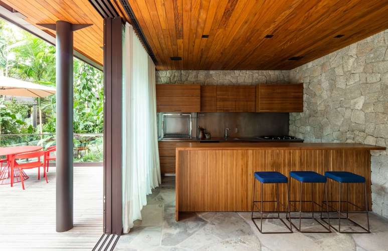 Com o desejo de ter um anexo em um terreno vizinho à casa da família para que, principalmente filhos e netos pudessem ter mais tempo de qualidade junto aos pais e avós, esta casa de 153 m², localizada em Iporanga, Guarujá, litoral sul de São Paulo, é envolta por muita natureza e leva a assinatura do escritório Daniel Fromer & Arquitetos, que buscou criar uma relação de coexistência entre a arquitetura proposta e o encantador ecossistema que basicamente "camufla" a casa.
