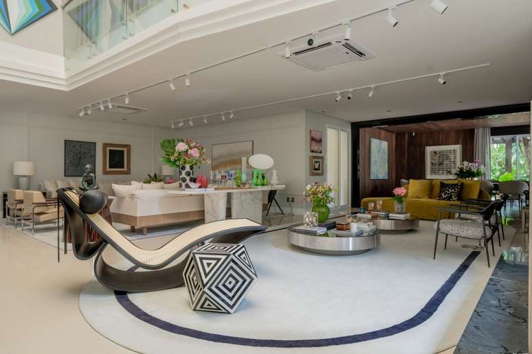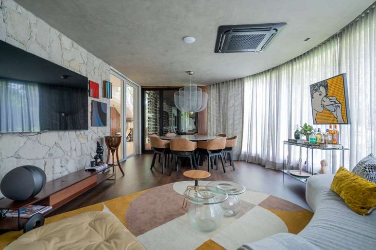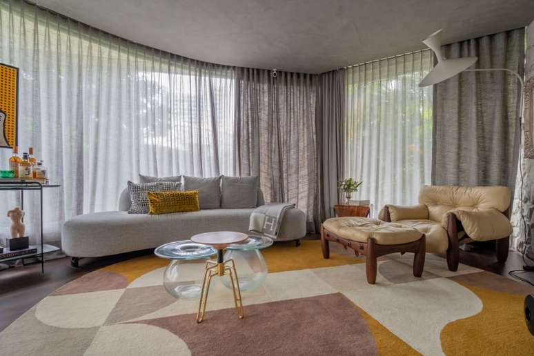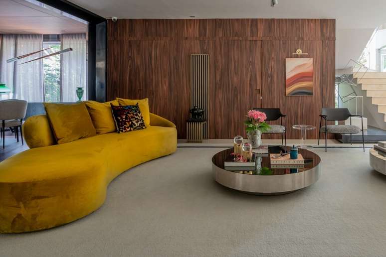 Ainda no piso inferior, o living integrado à sala de estar com tem estilo moderno e atemporal. O mobiliário conta com um sofá orgânico em cor mostarda, mesas de centro e poltronas do designer brasileiro Jader Almeida e a Chaise Lounge Rio, projetada por Oscar Niemeyer.