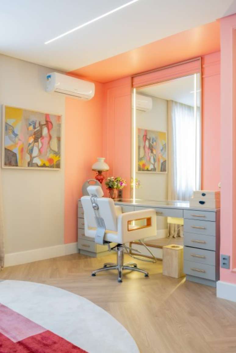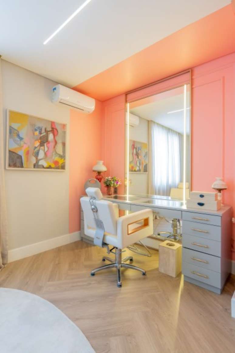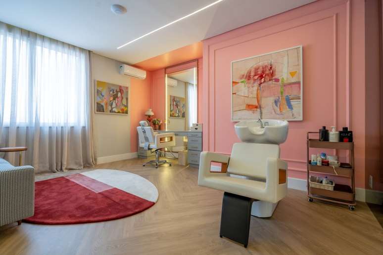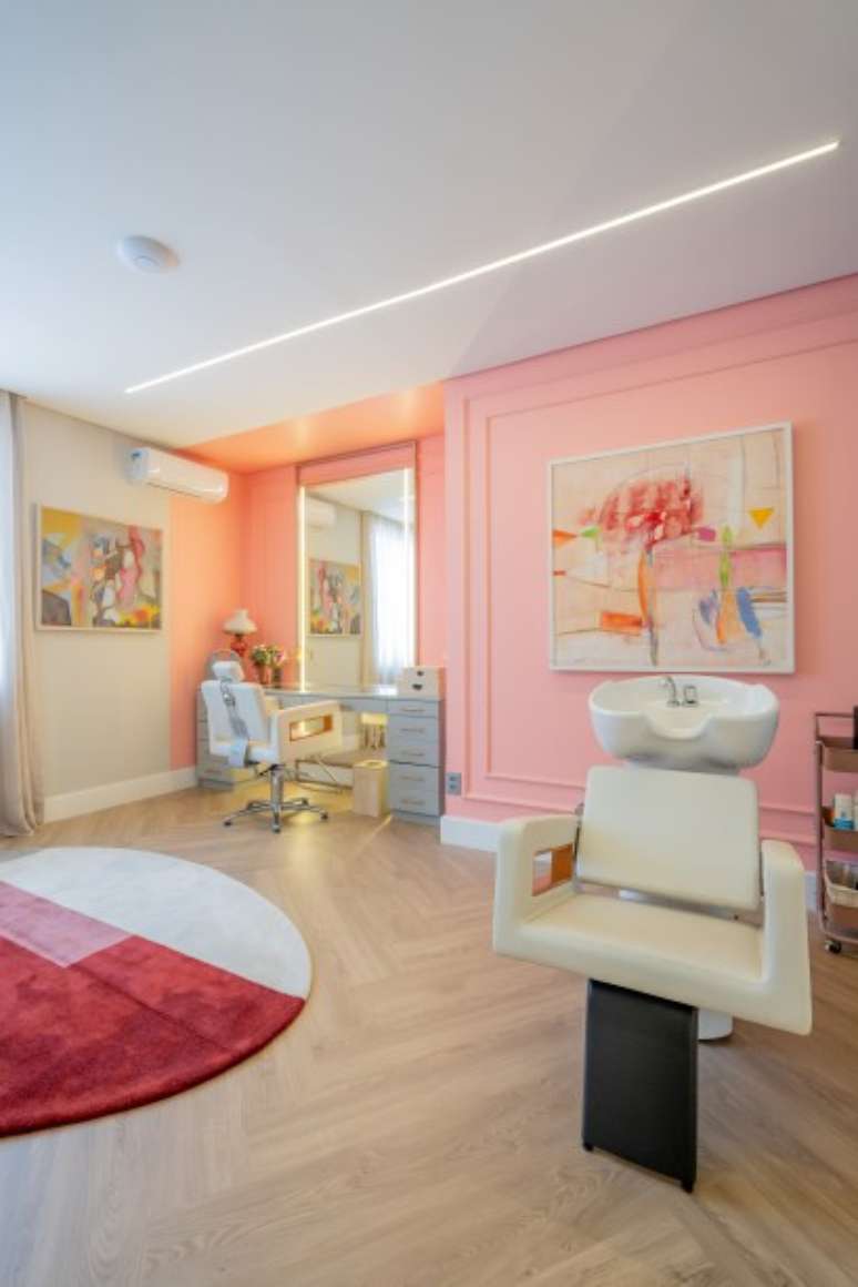 O charme da casa, porém, é o salão de beleza. Um espaço com paleta de cores suaves, o salão é o sonho de qualquer pessoa apaixonada por autocuidado e estética.