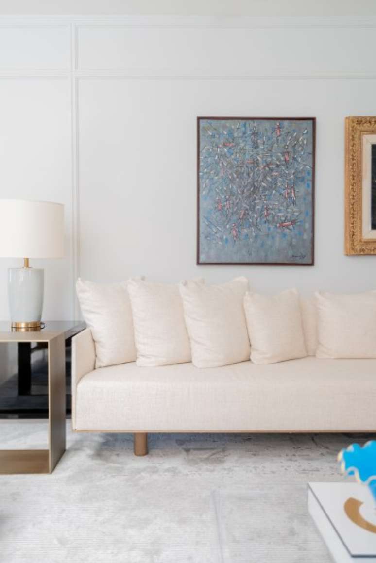 Na sala de estar do piso inferior, o destaque é o uso das boiseries, que criam um espaço sofisticado e acolhedor.