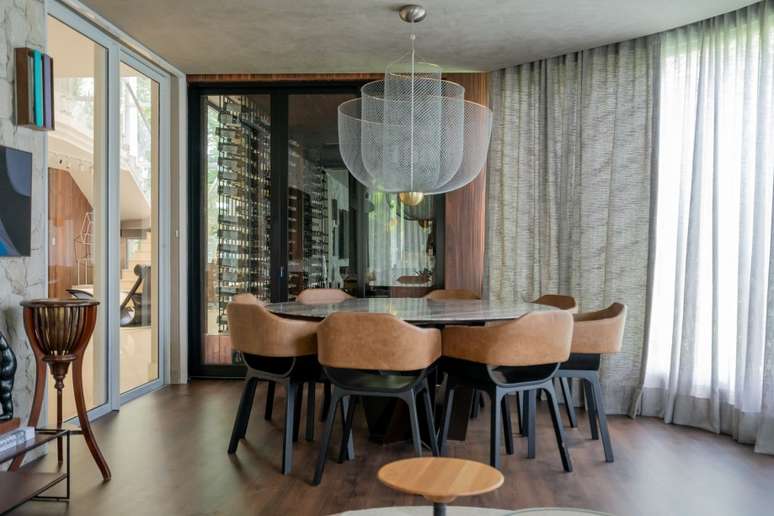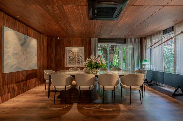 Já na sala de jantar, a madeira pau ferro é o material predominante nas paredes e teto. A mesa retangular comporta dez pessoas, perfeita para receber amigos e familiares.