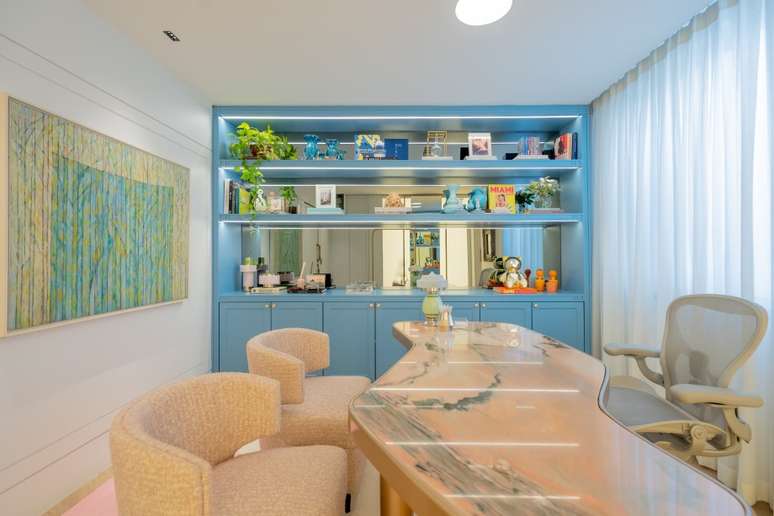Para os momentos de trabalho, o home office foi concebido a partir do tom azul da estante. Ele conta possui ainda uma mesa desenhada pelo próprio escritório em pedra natural.