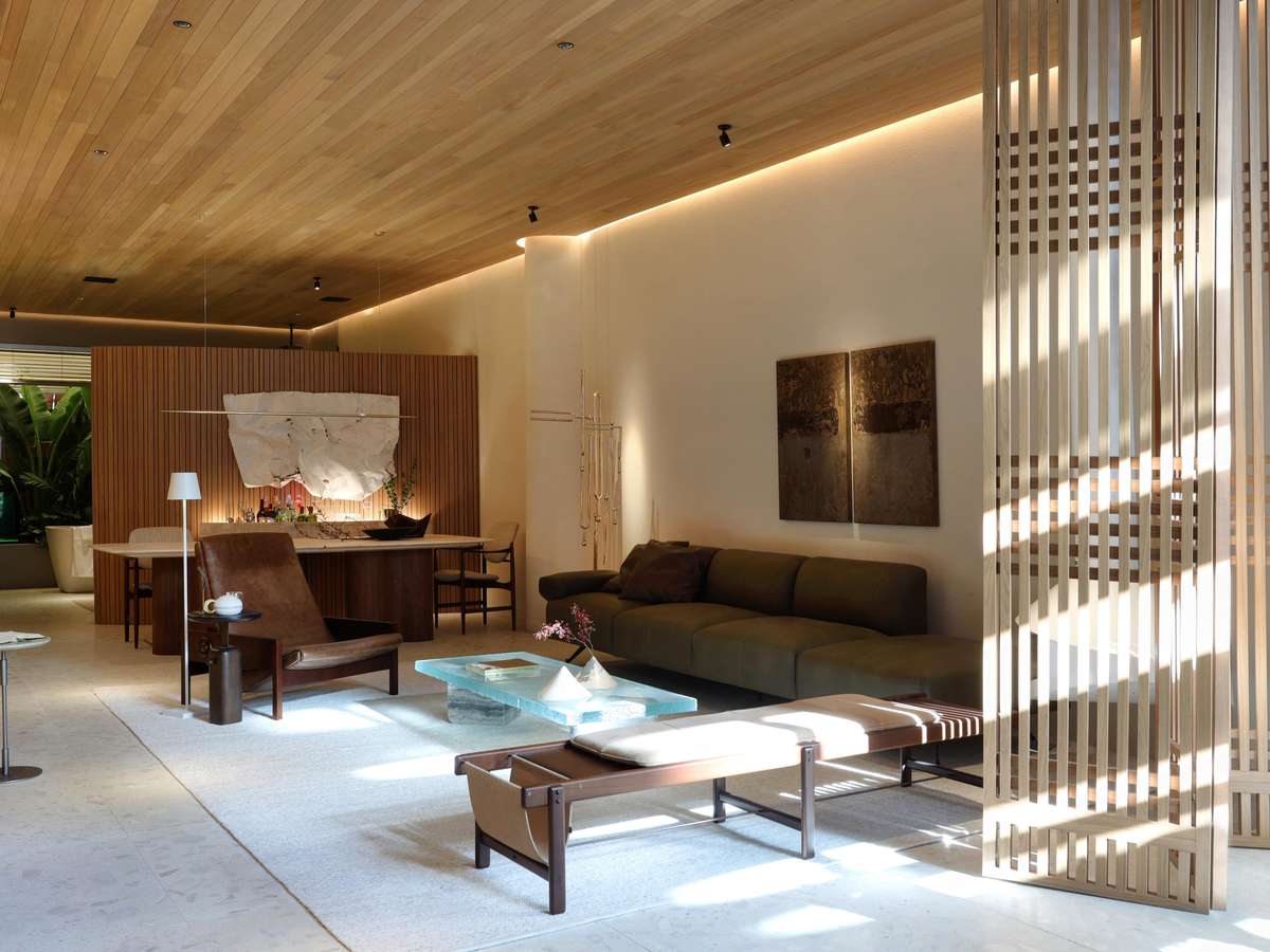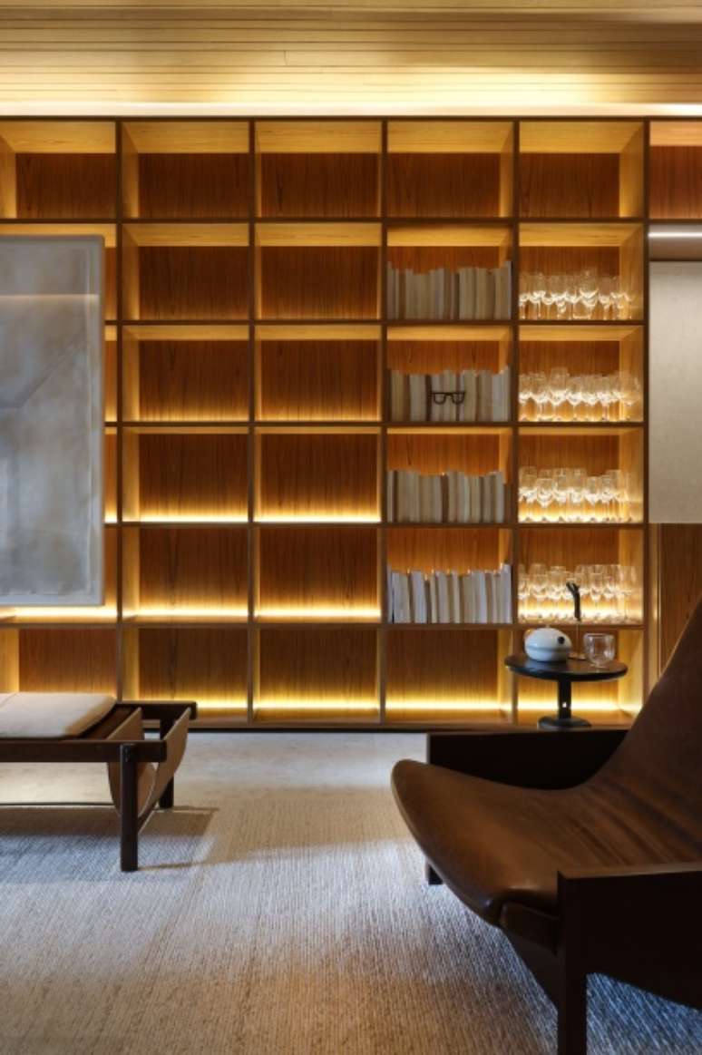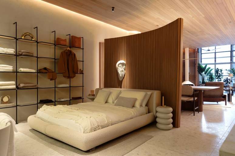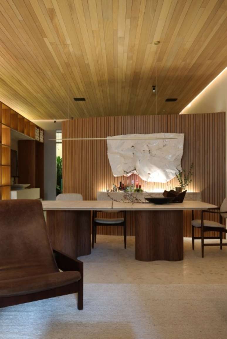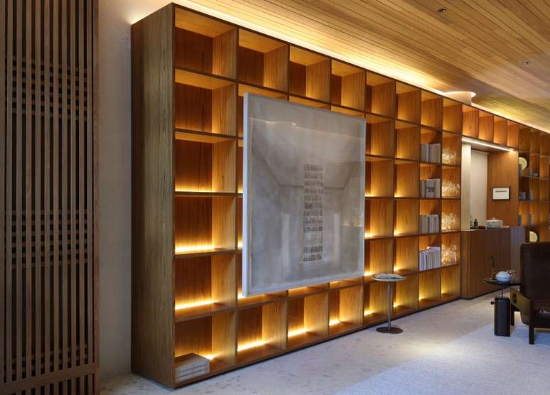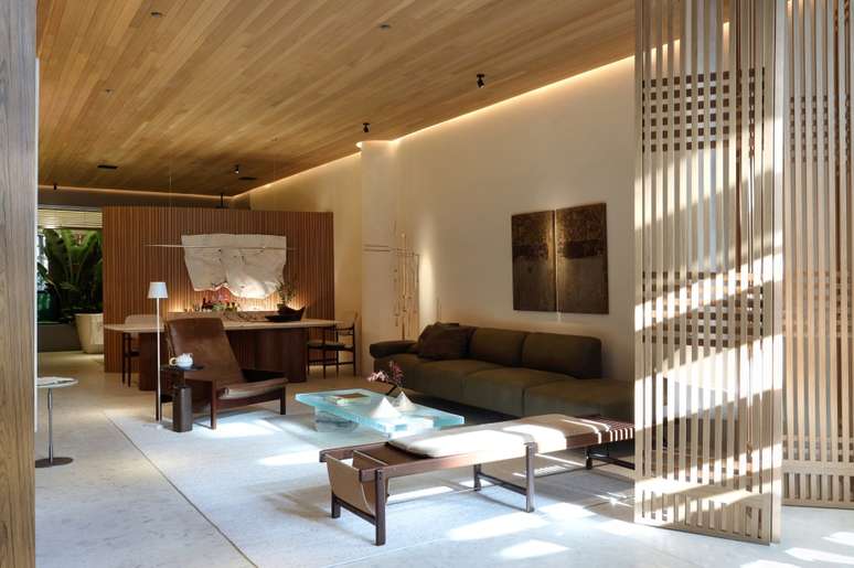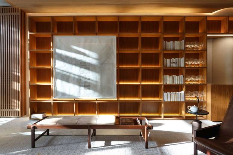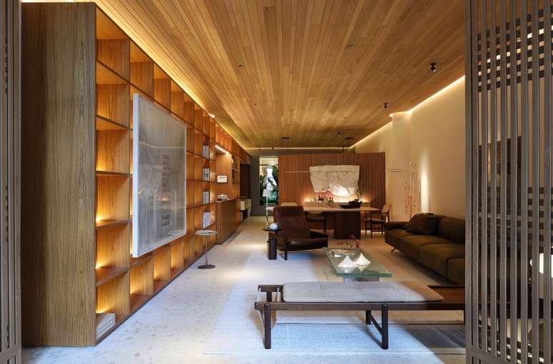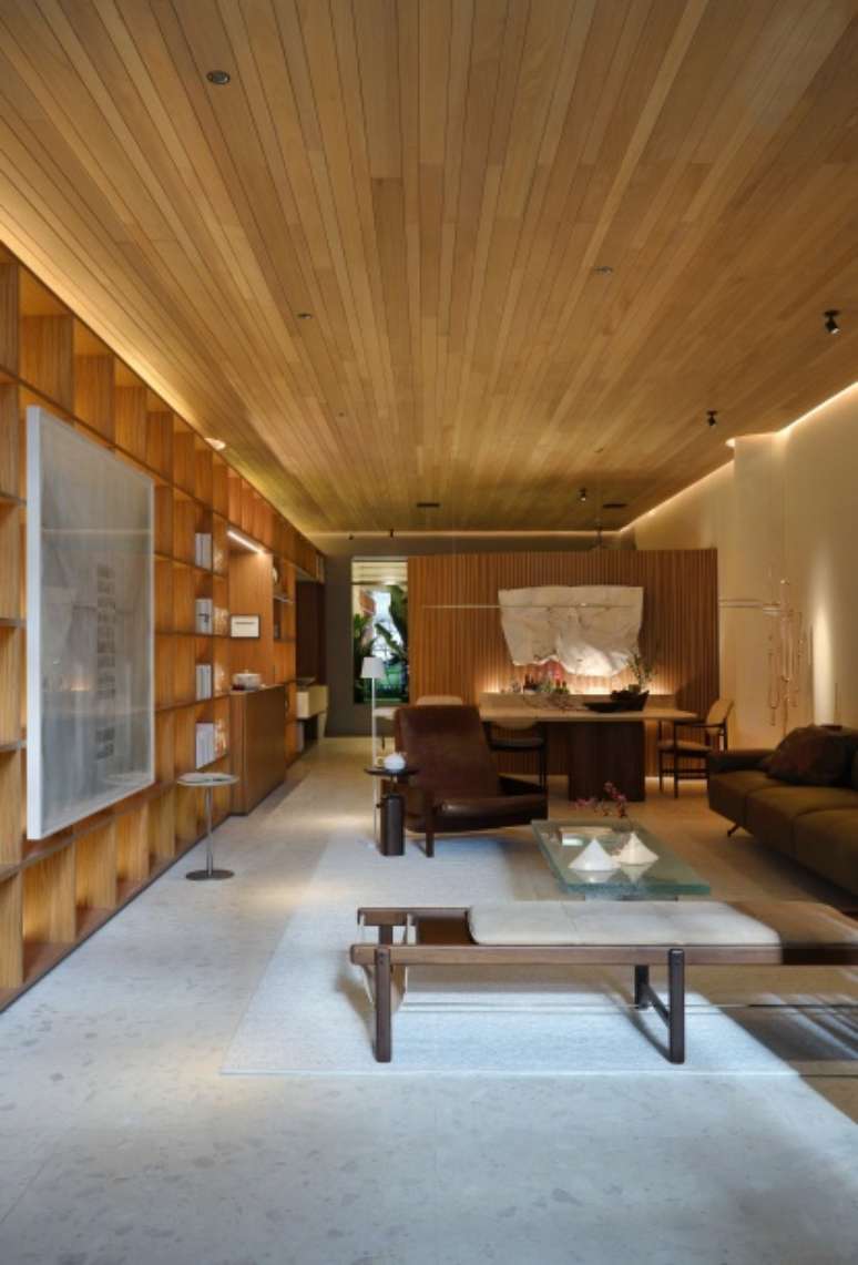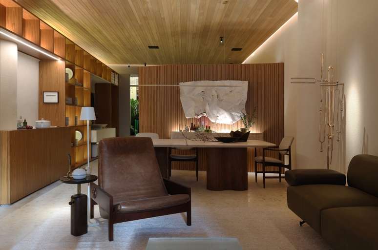 Para garantir mais conforto, a profissional criou um forro todo paginado com madeira tauari. E escolheu uma marcenaria planejada, feita em uma parceria exclusiva com a Criare, que tem como destaque uma grande estante de lâmina de madeira freijó, desenhada por ela especialmente para a mostra.