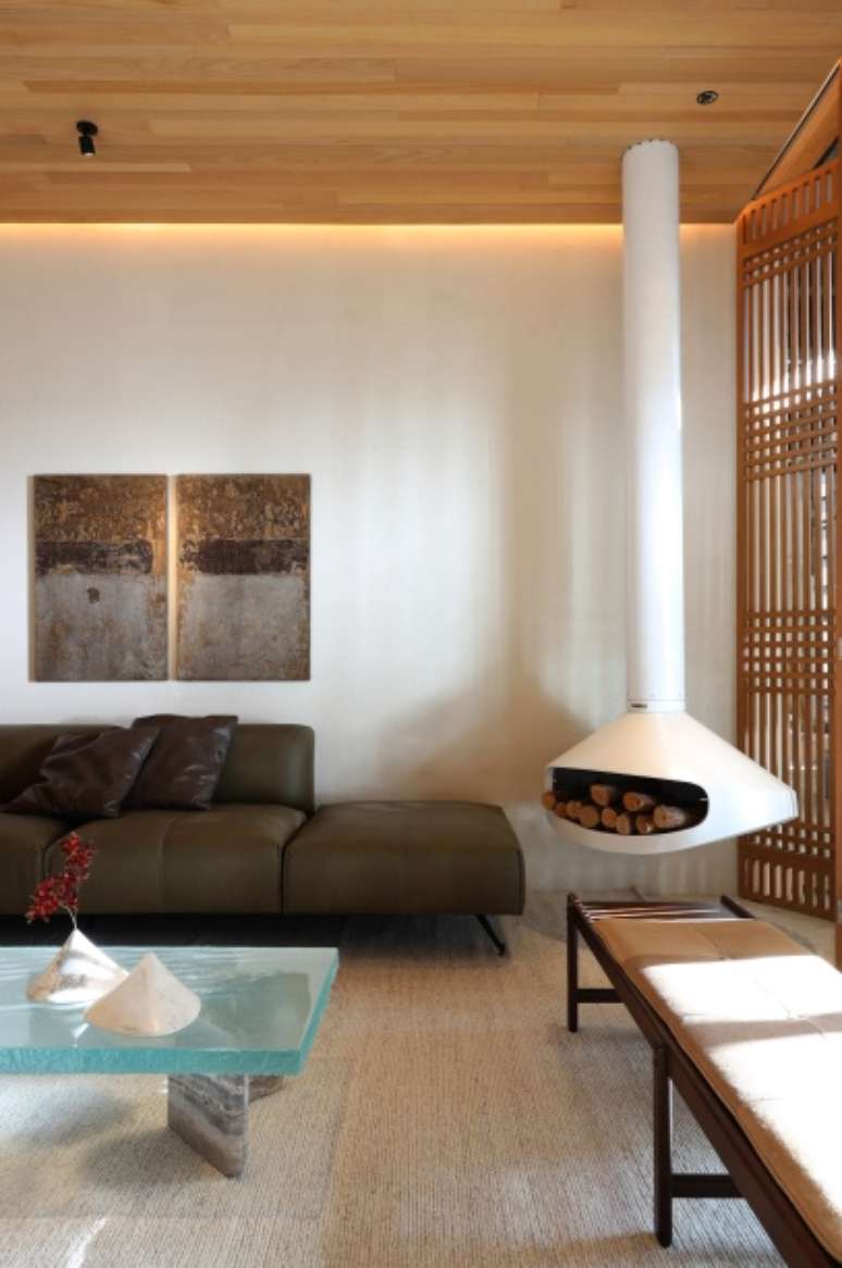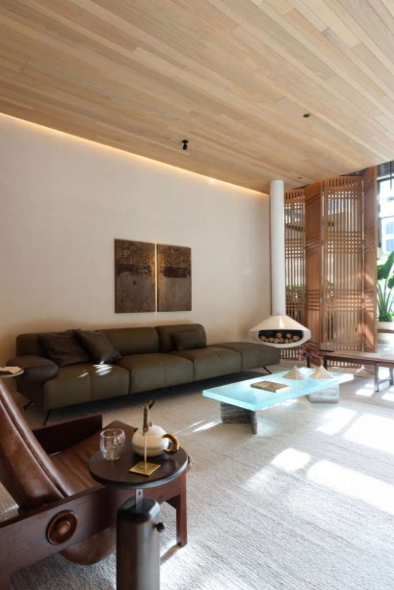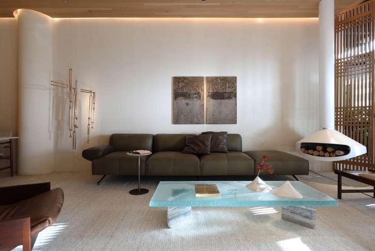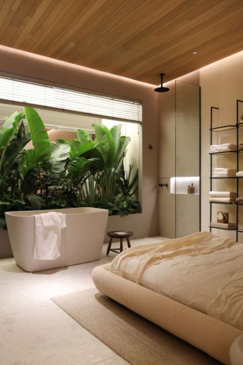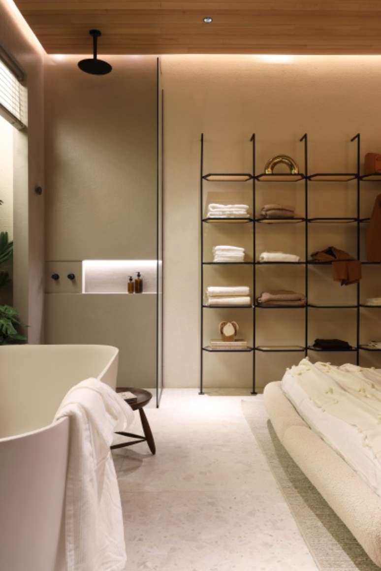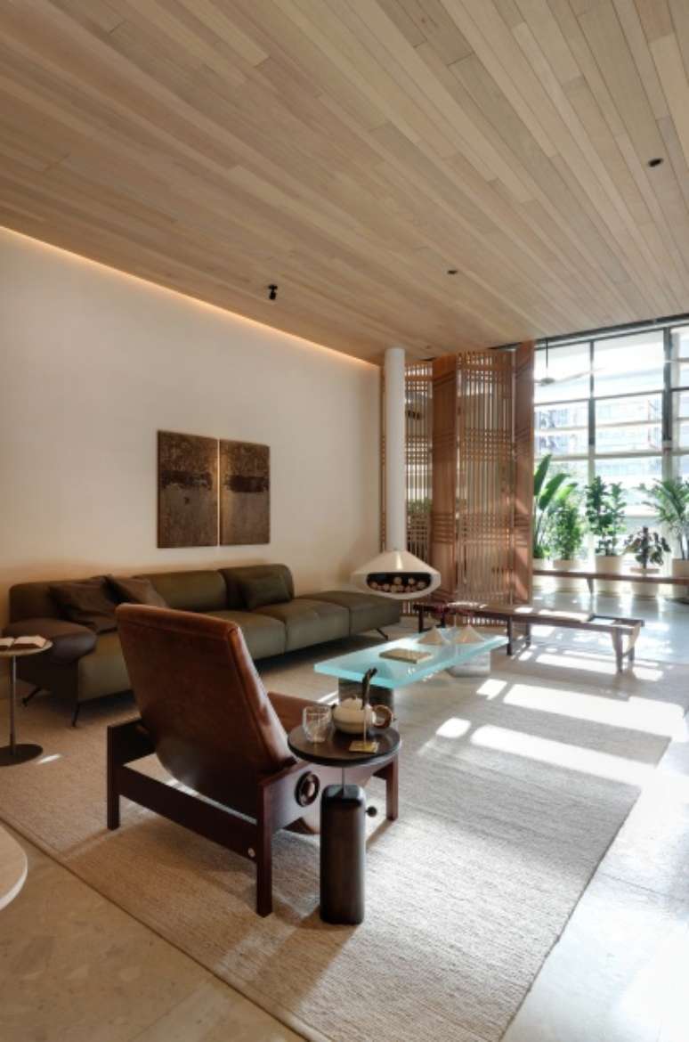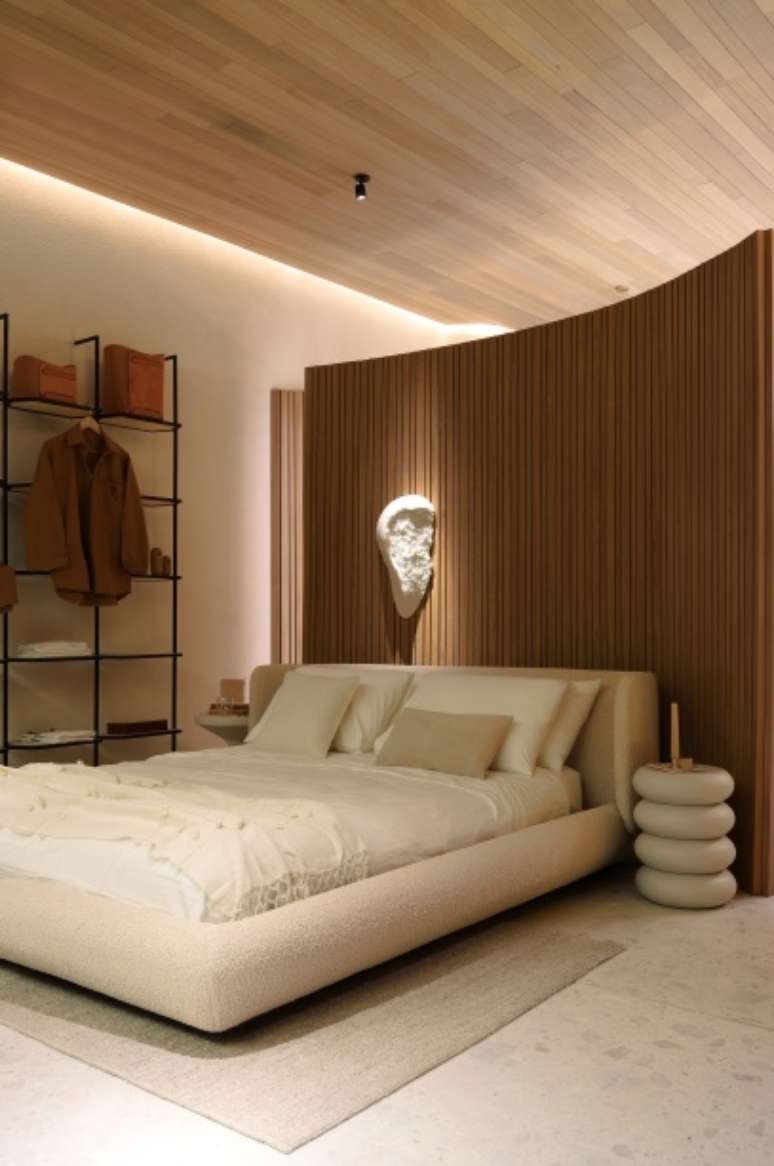 Para garantir mais conforto, a profissional criou um forro todo paginado com madeira tauari. E escolheu uma marcenaria planejada, feita em uma parceria exclusiva com a Criare, que tem como destaque uma grande estante de lâmina de madeira freijó, desenhada por ela especialmente para a mostra.
