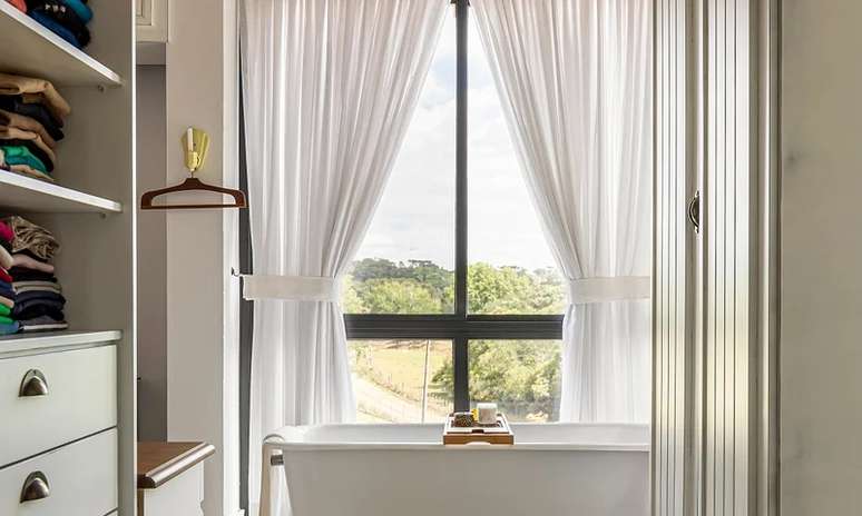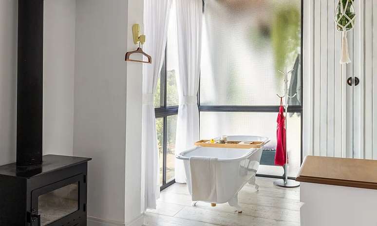 No banheiro principal, que também é o cantinho preferido da moradora, a banheira ganha espaço destaque e possui vista privilegiada para todo o terreno, que ainda tem um pomar. A banheira é clássica, dos anos 1930 e de ferro fundido.
