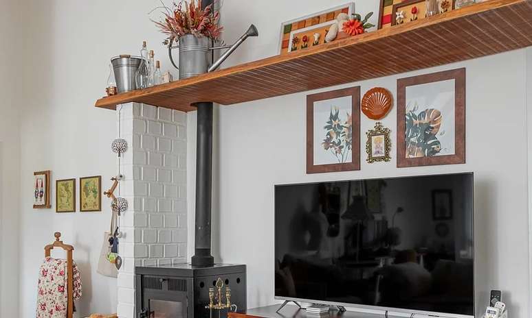 A sala de estar segue a simetria do espaço, e para aquecer os dias mais frios, uma lareira em ferro fundido complementa o ambiente agradável. Na cozinha, mesmo com pegada rústica e romântica, como antigas fazendas, os eletrodomésticos tecnológicos têm seu espaço e funcionalidade.