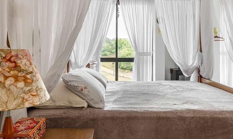 Na decoração, o romantismo é reforçado pelo dossel e pelos móveis de estilo. O quarto de hóspedes traz memórias através de móveis herdados pela família da proprietária e decorado com artesanato dela.