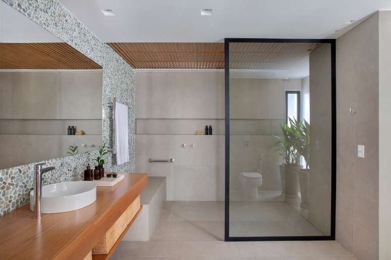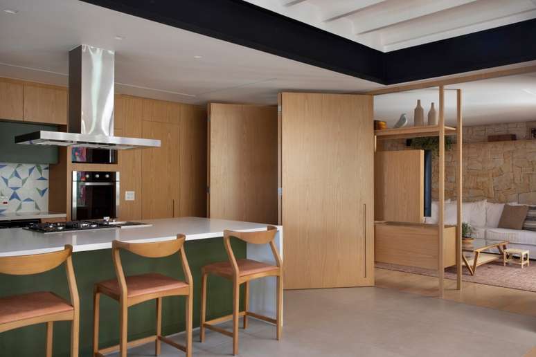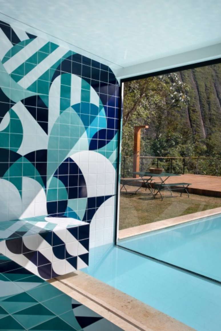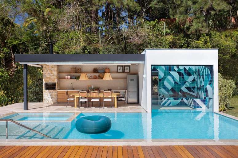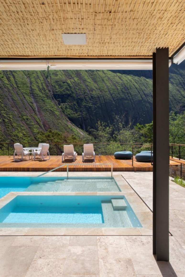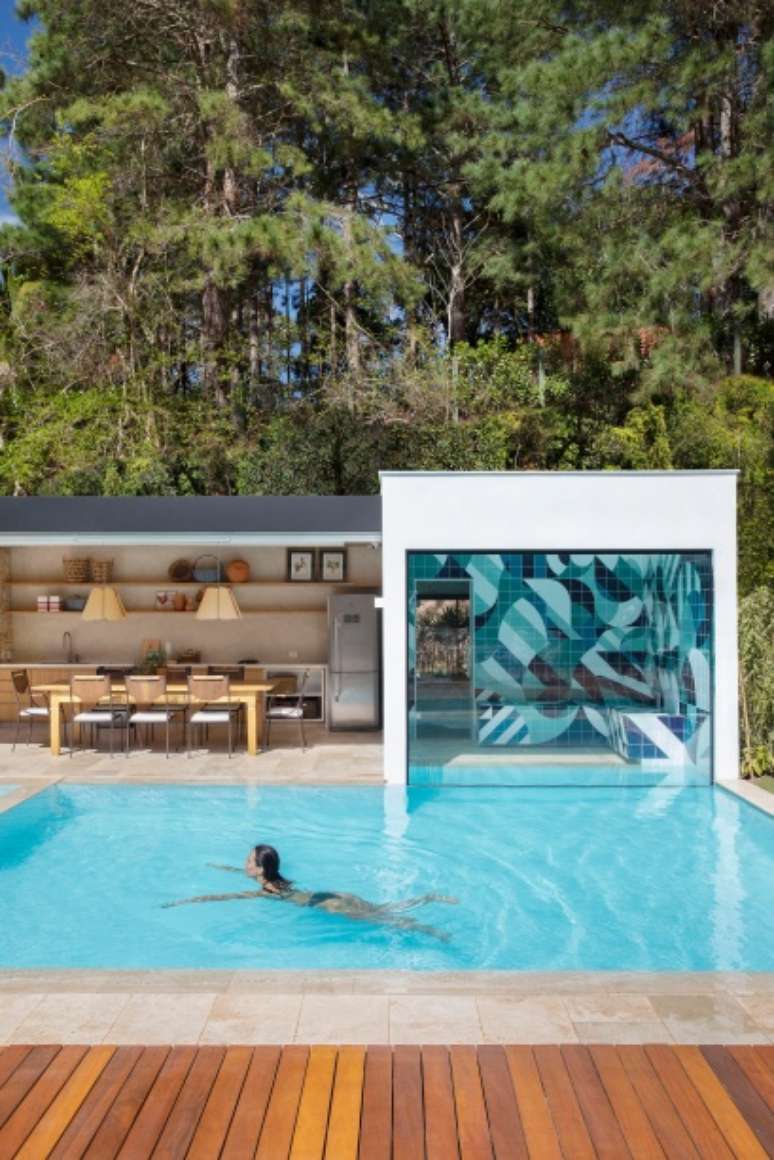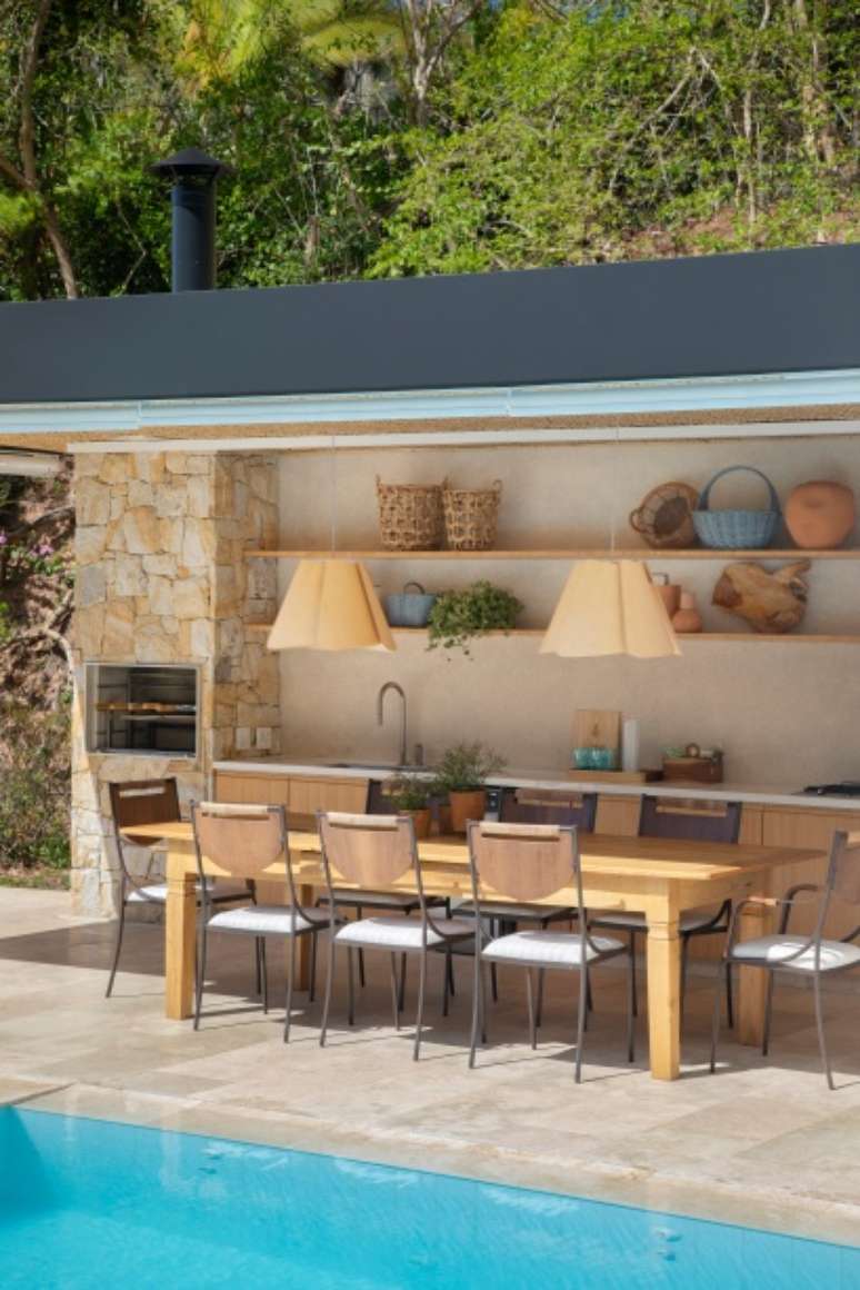 Já a área gourmet da piscina foi projetada do zero: "buscamos criar um espaço aberto que valorizasse a vista. Projetamos uma cobertura em estrutura metálica que abriga a churrasqueira, a sauna, o lavabo e um chuveirão. O vidro fixo da sauna faz com que a natureza entre no ambiente e crie ainda mais integração", explica Victoria.
