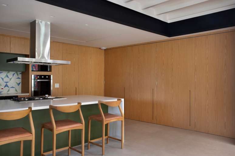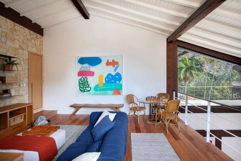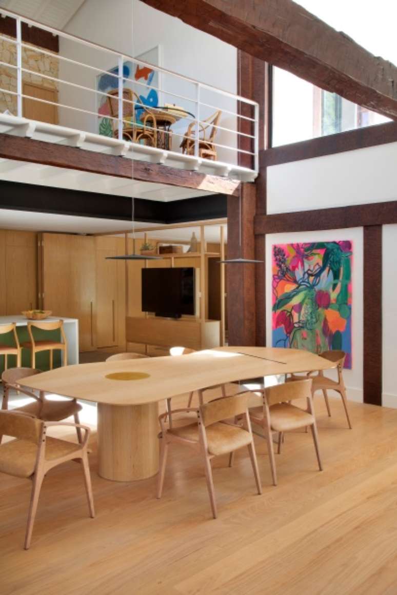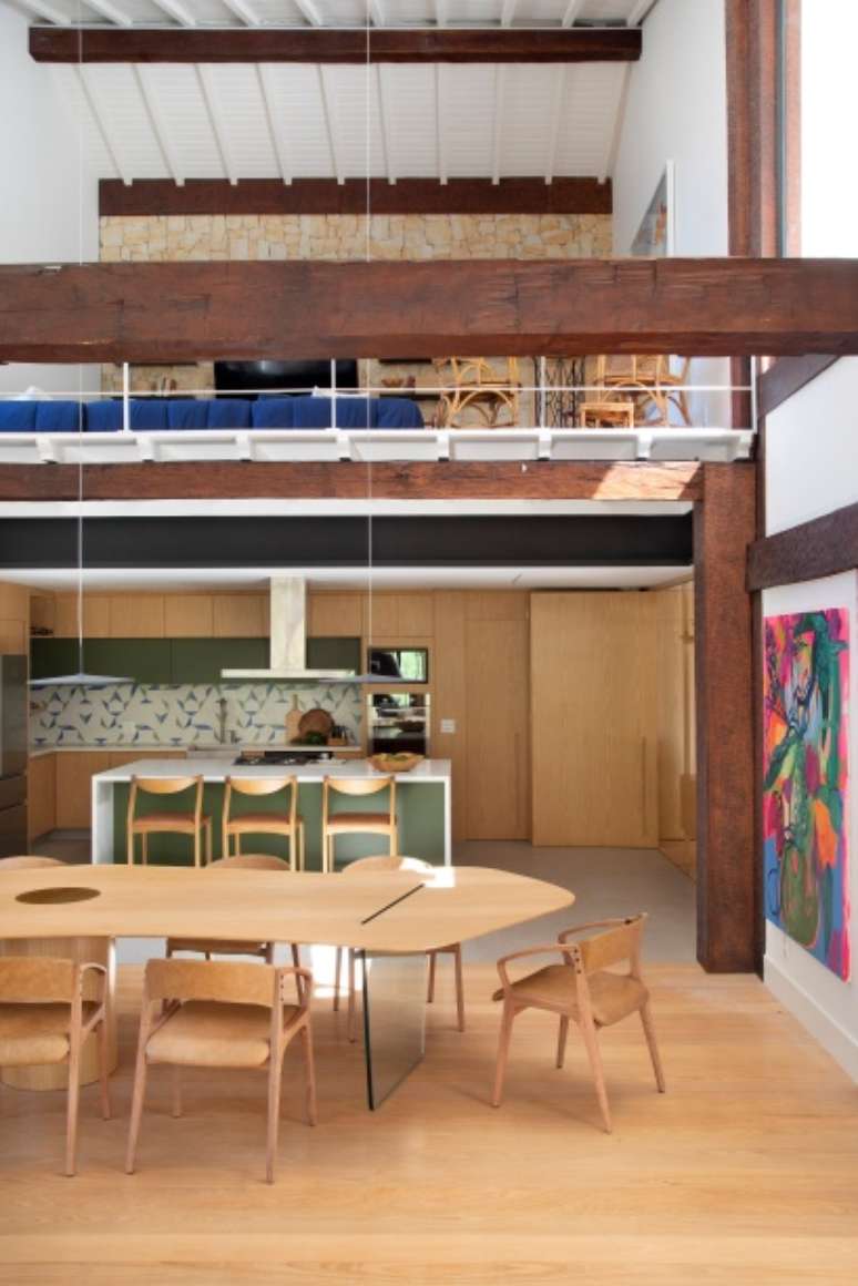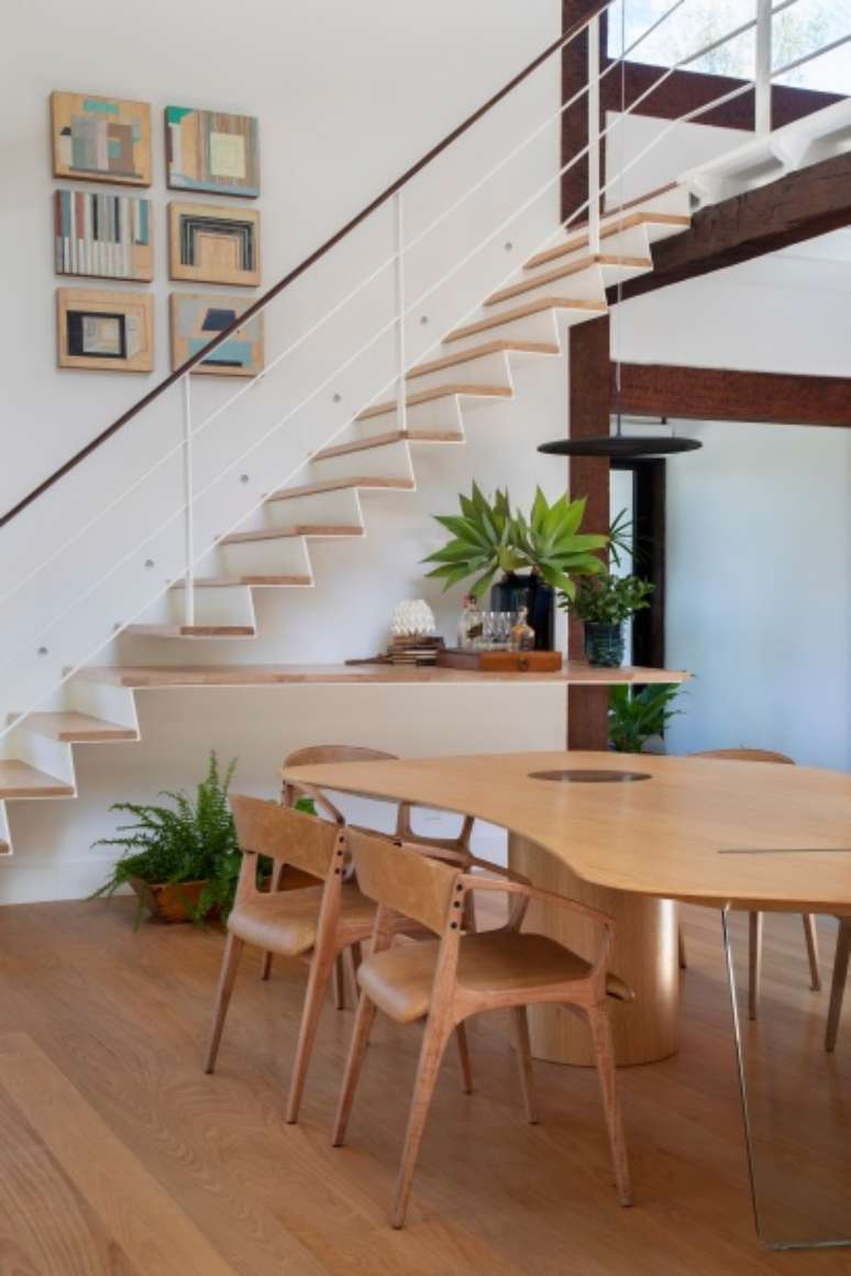 "Trocamos também a antiga escada de madeira por uma escada metálica mais leve e atual - um dos degraus avança até o final da parede, servindo como aparador para a mesa de jantar. Ela leva até o mezanino, que funciona como uma sala mais privativa e salão de jogos", descreve Marina.