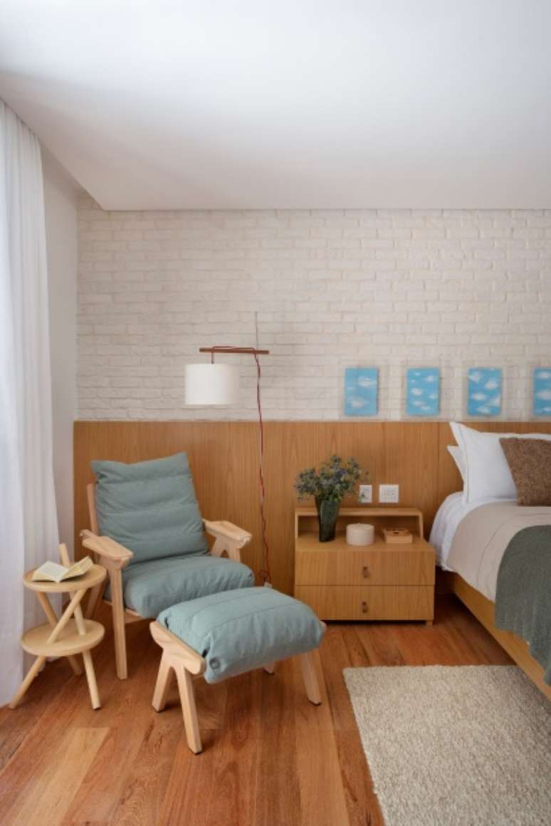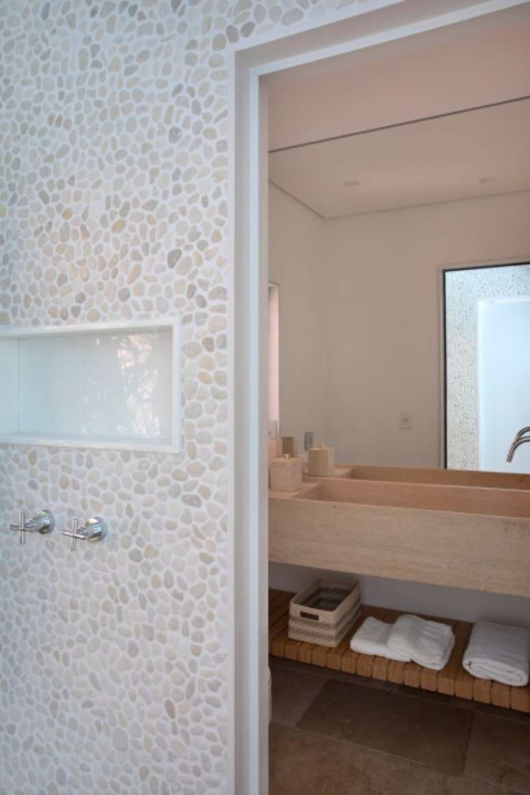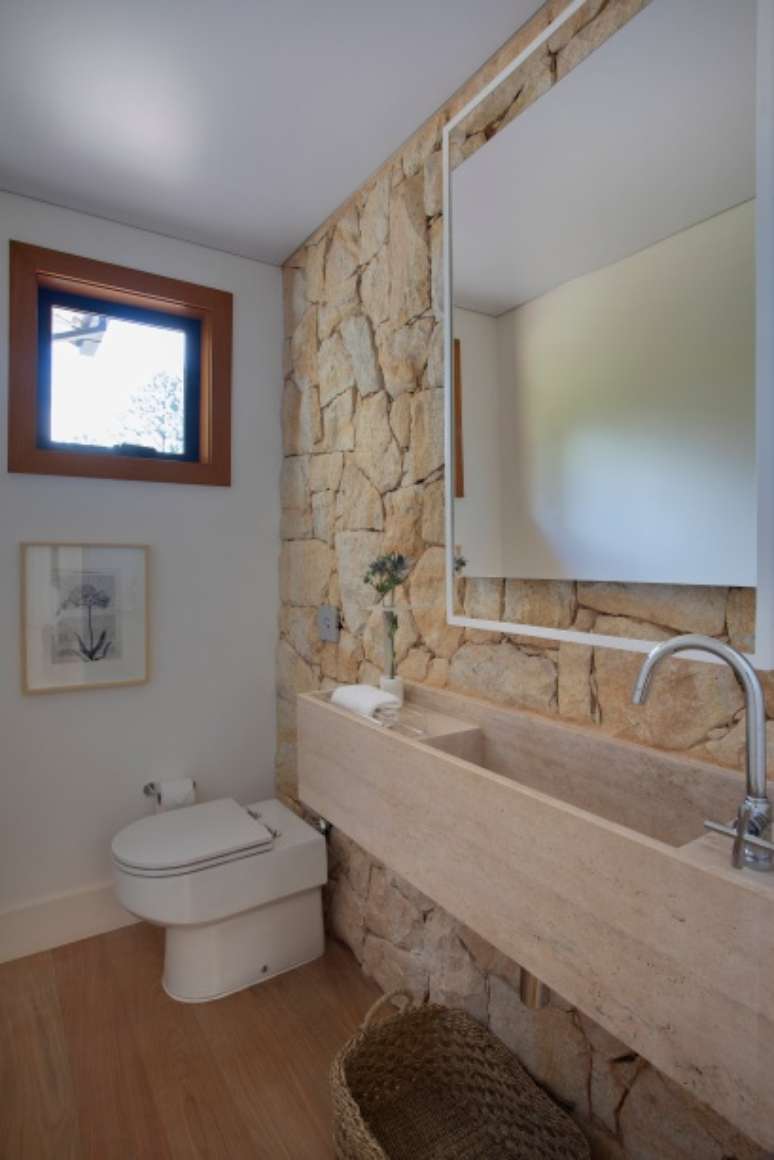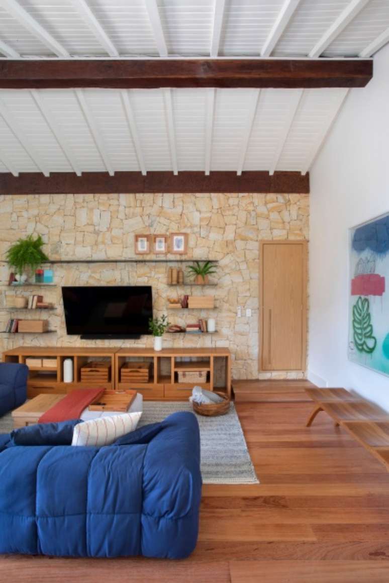 Em relação aos revestimentos, foram usados principalmente materiais naturais, para conferir aconchego e unidade à casa, e apenas três tipos de piso no projeto: madeira para as áreas internas e secas, porcelanato para áreas molhadas internas e travertino em toda área externa. Algumas paredes foram revestidas com pedra madeira, material presente no exterior da casa original.