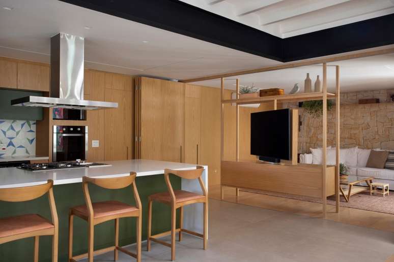 A casa antiga era muito subdividida, com sala de jantar, copa e cozinha separadas e com seis quartos no total, acima da necessidade da cliente. Na reforma, toda a área social no primeiro andar foi integrada e um dos quartos foi transformado em sala de TV, que pode ser aberta para a cozinha e a sala ou fechada por um painel com o sistema de porta-camarão.