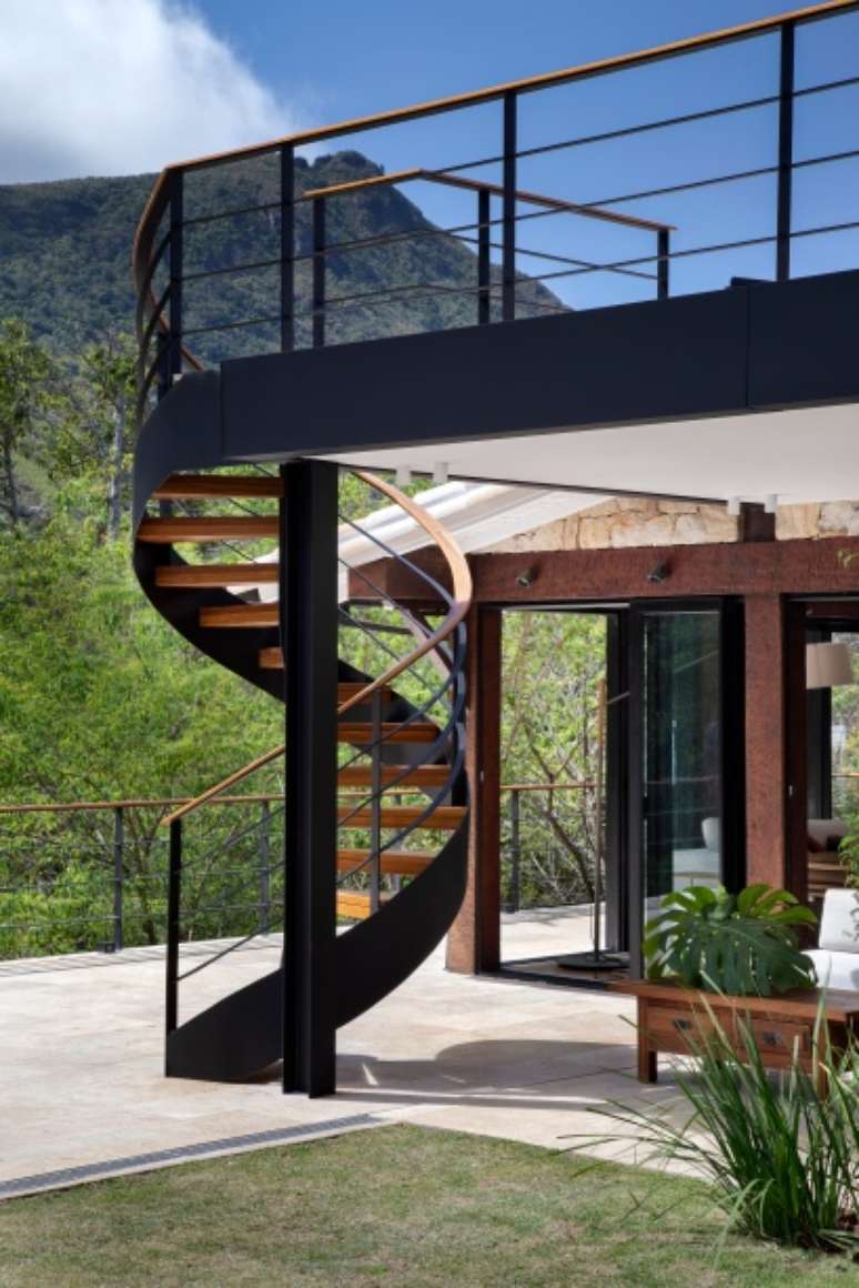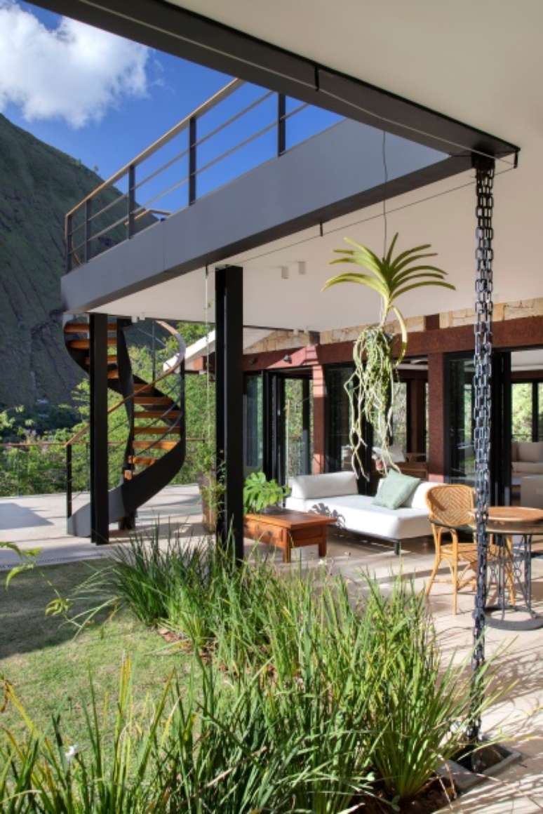 No segundo andar, foi criada uma varanda para os quartos, que funciona como um ambiente contemplativo e dá cobertura para a varanda do piso inferior, com o acréscimo de um acesso externo pela escada helicoidal.