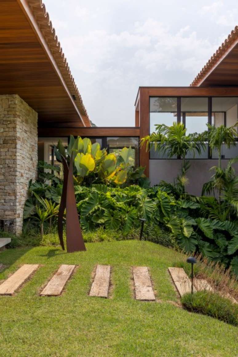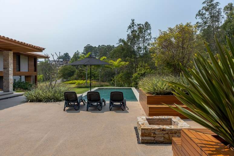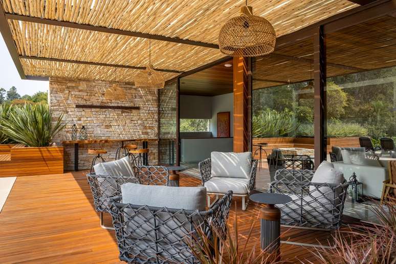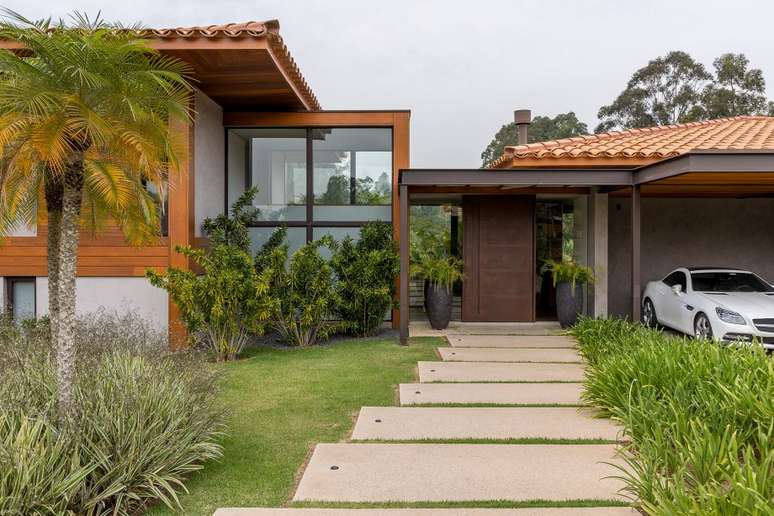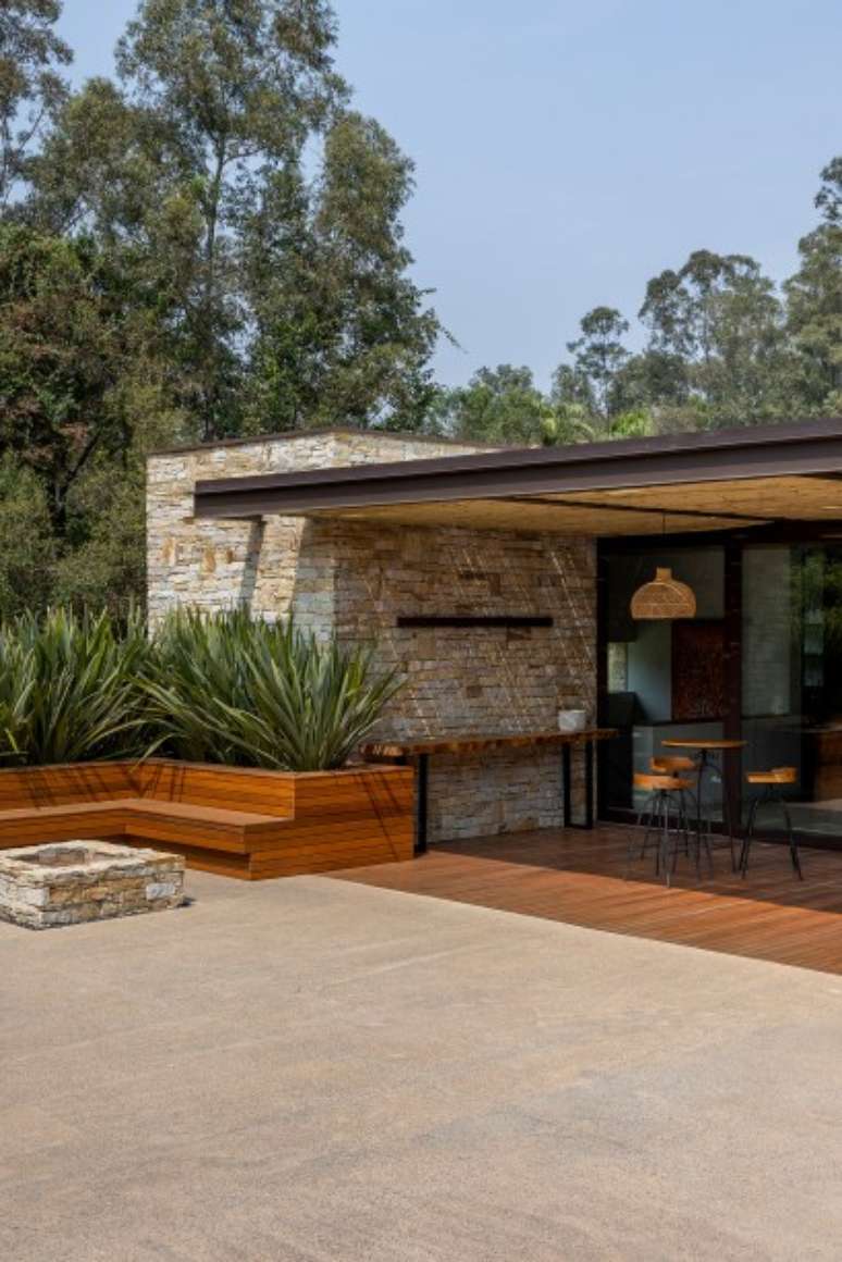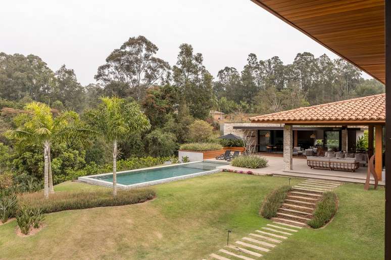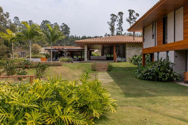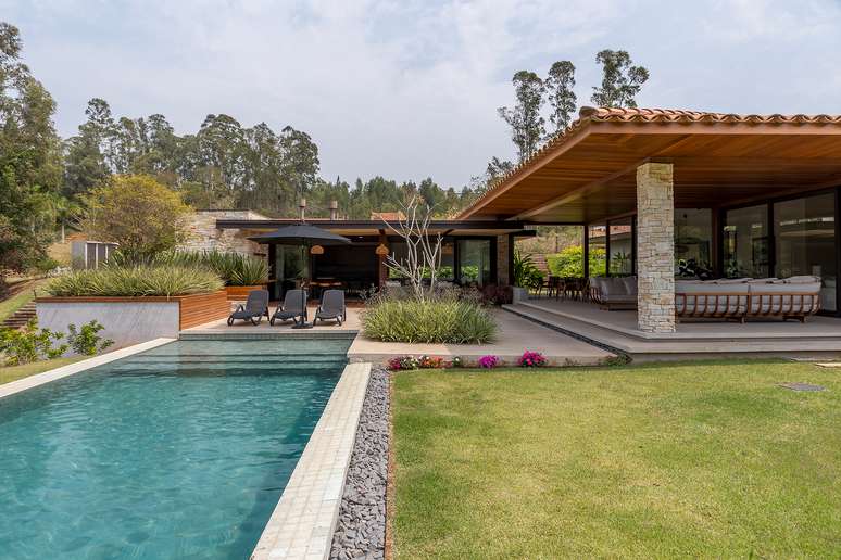 Na paleta de materiais predominam os itens naturais, como pedra, madeira e telhas de barro. Como os clientes solicitaram ao escritório que as esquadrias fossem de alumínio, a solução foi pintá-las de marrom fosco e fixá-las na madeira para integrar ao décor.