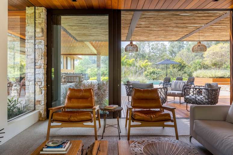 As amplas esquadrias de vidro ajudam na interligação entre os ambientes oferecendo uma sensação de amplitude e conectando ainda mais a casa com o seu exterior. Além da interligação, os grandes painéis de vidro possibilitam a entrada de luz natural.