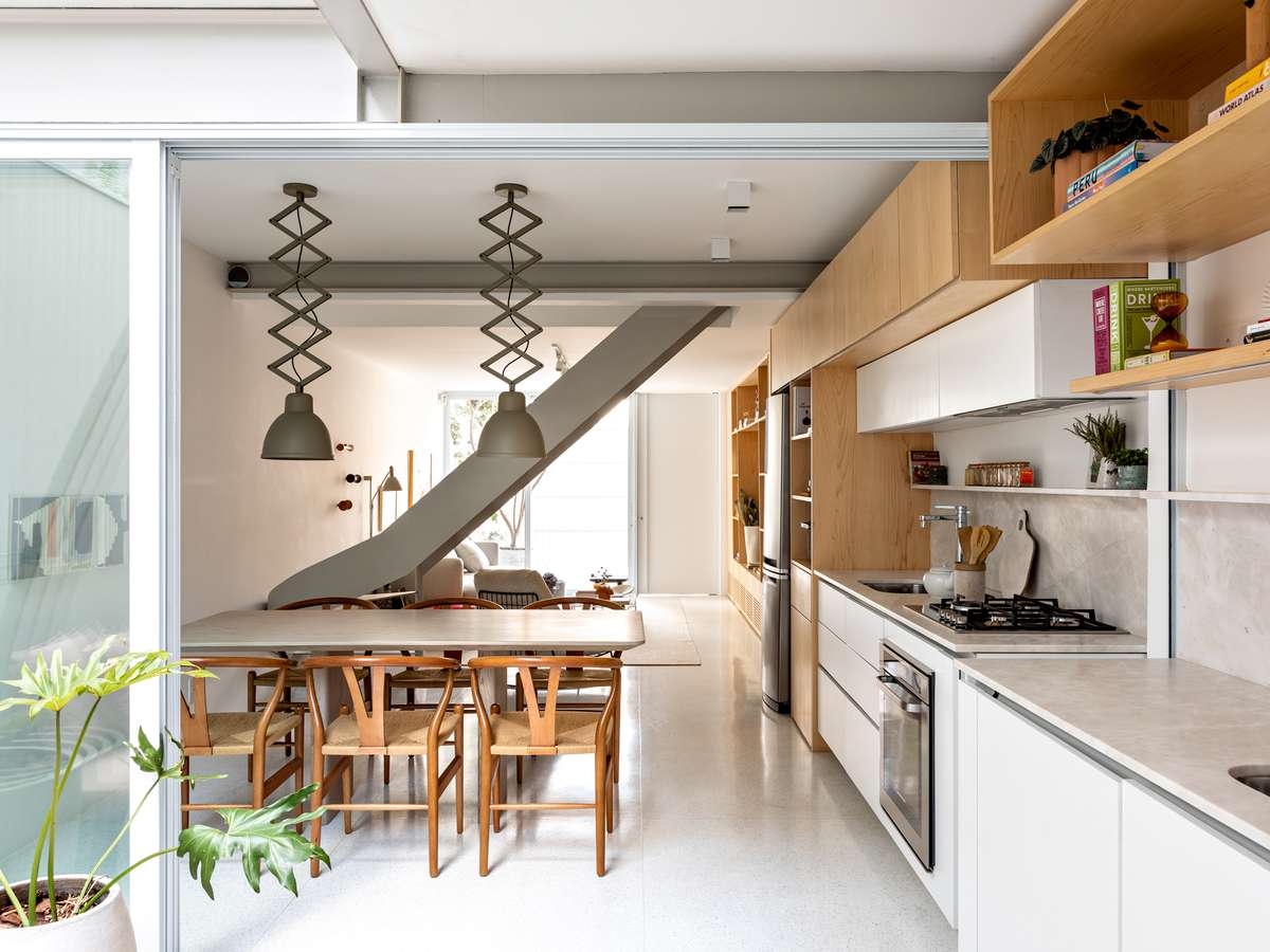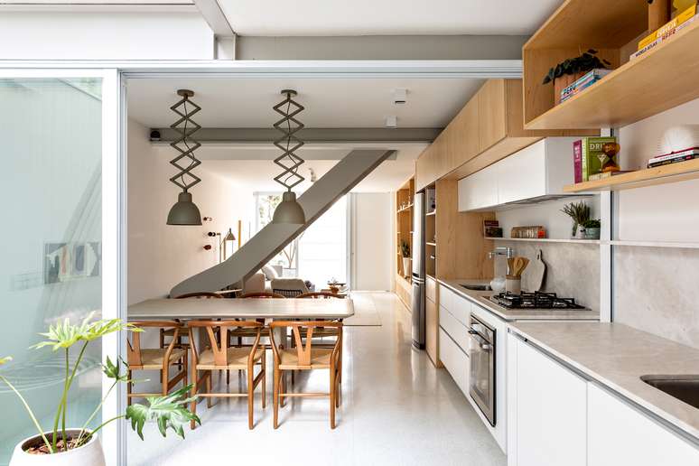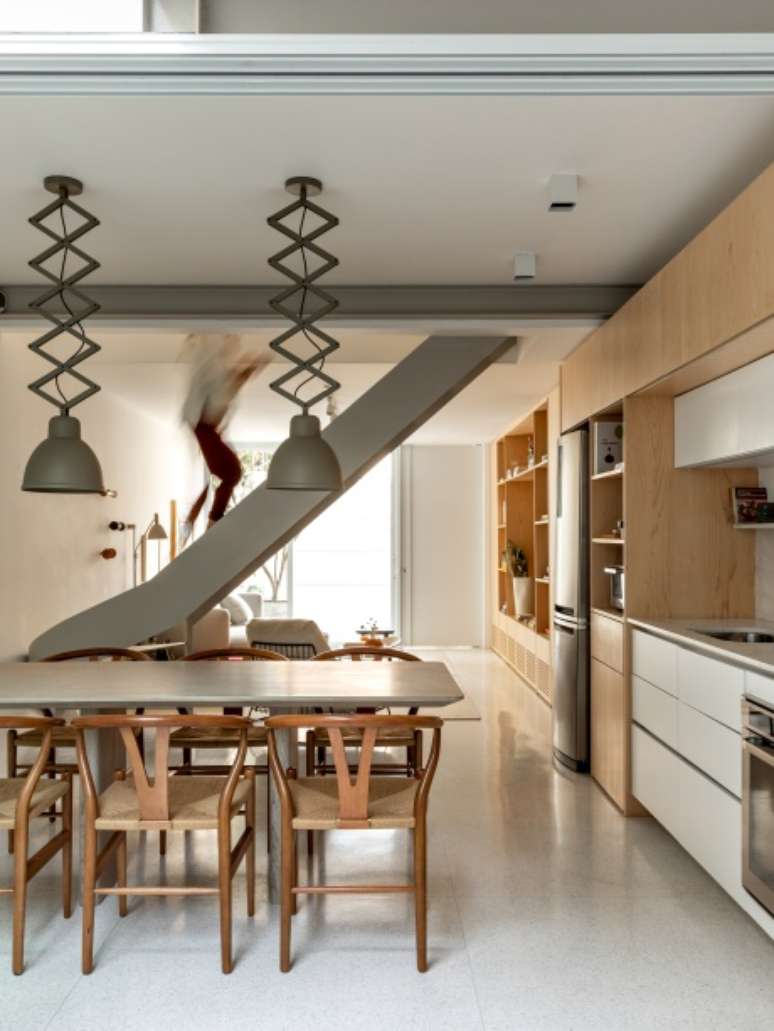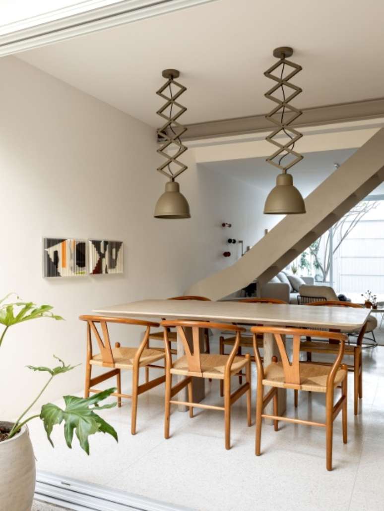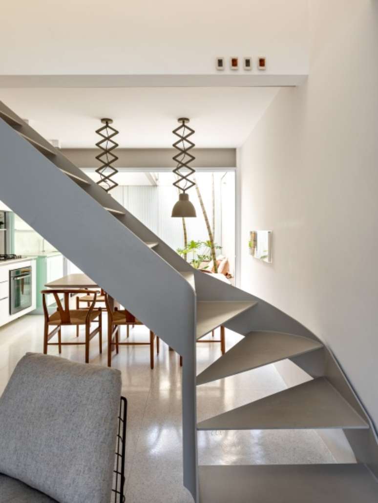 Casa de vila ganha escada escultórica e luminárias pantográficas