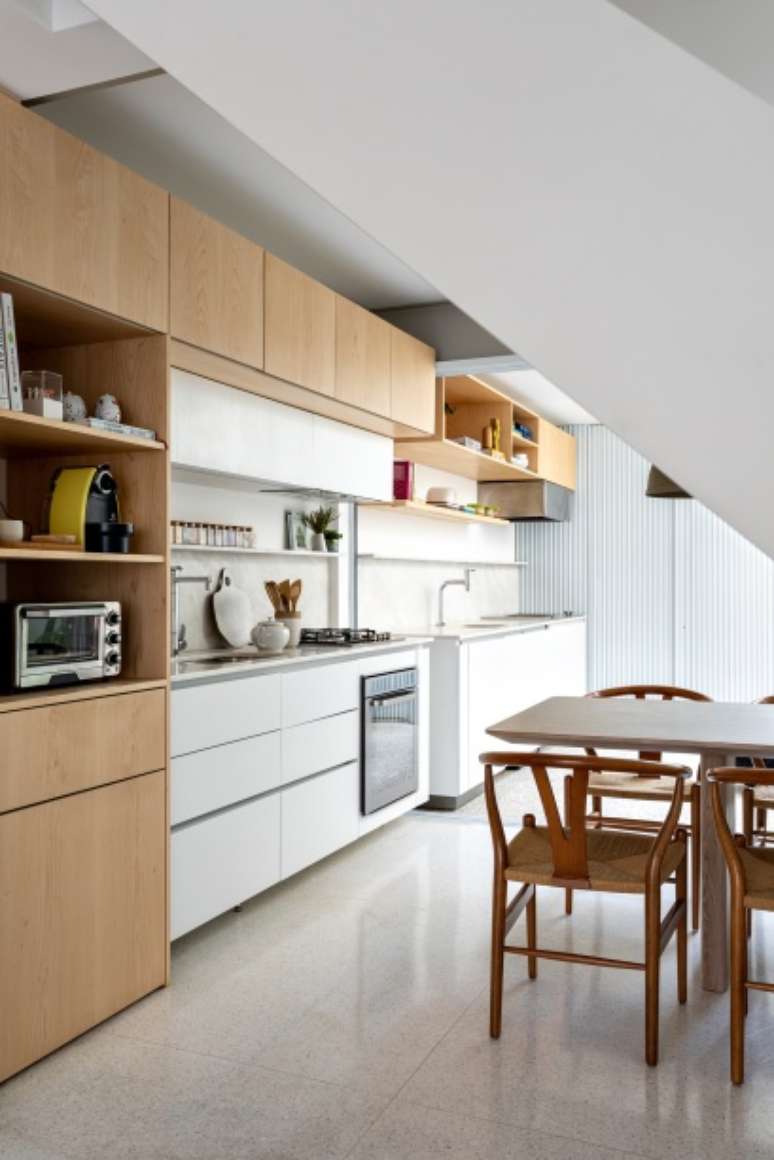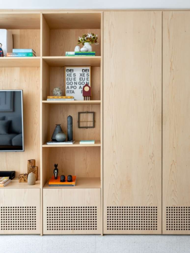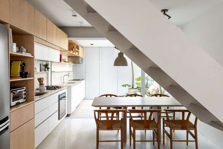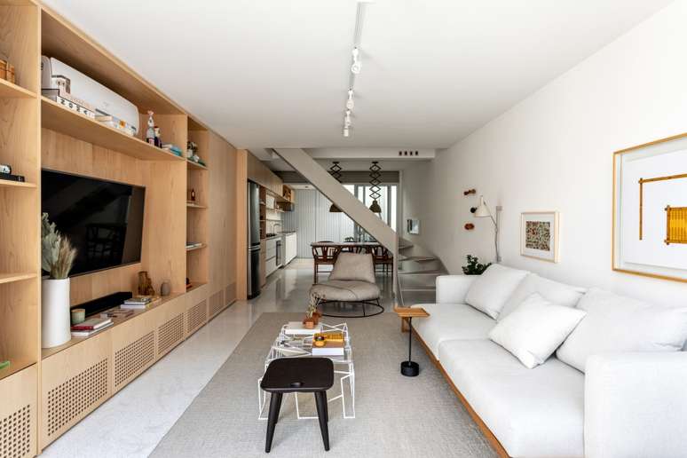 As arquitetas realizaram uma grande intervenção no imóvel e a maior delas foi alterar a escada, que antes ficava onde hoje tem o grande móvel linear. "Foi um grande desafio esse deslocamento, como um quebra-cabeça, mas que obteve um excelente resultado, encaixando-o no sentido contrário, que corta a casa ao meio, entre sala de estar e TV, jantar, cozinha e área externa", explicam as profissionais.
