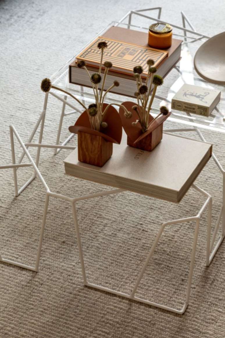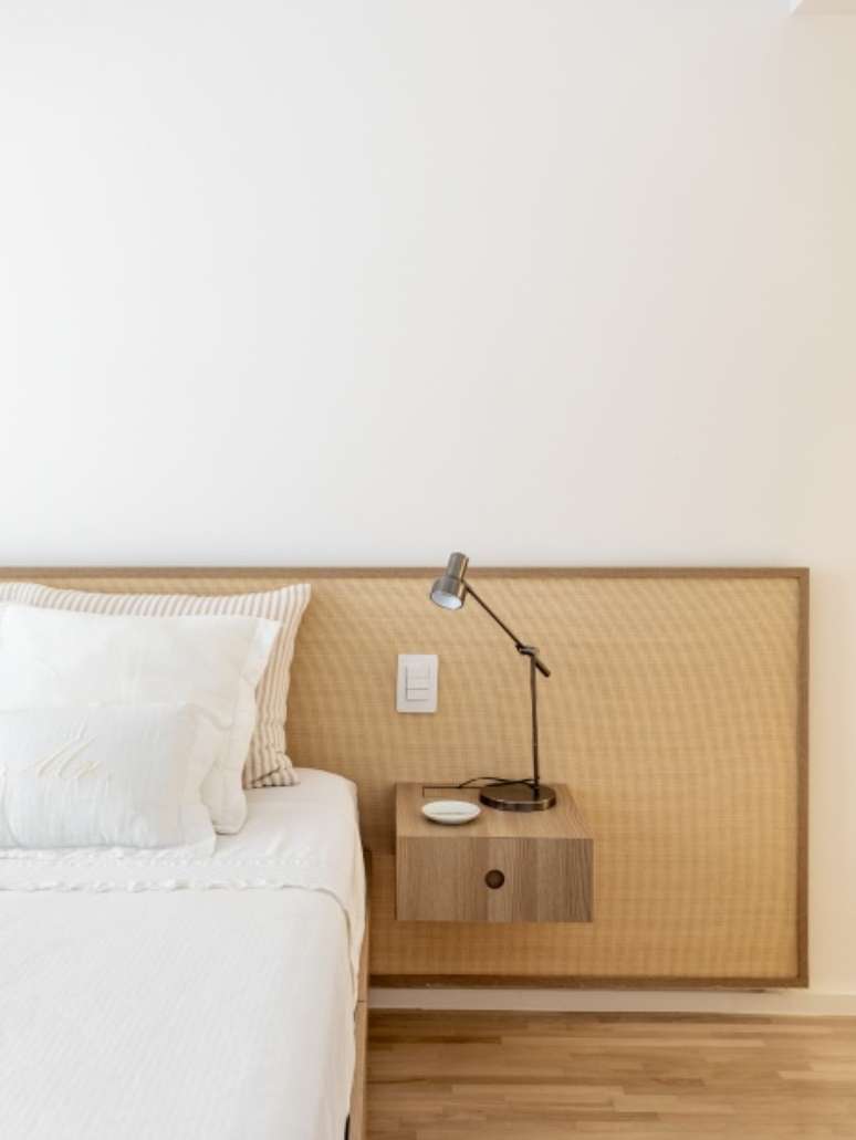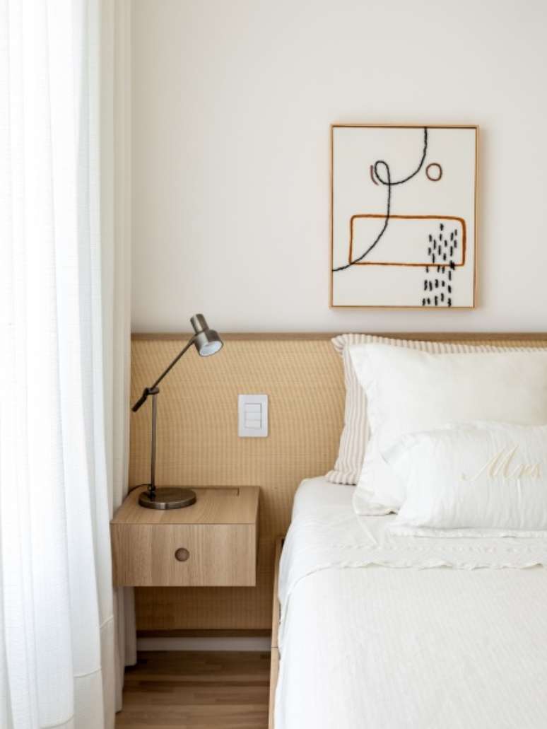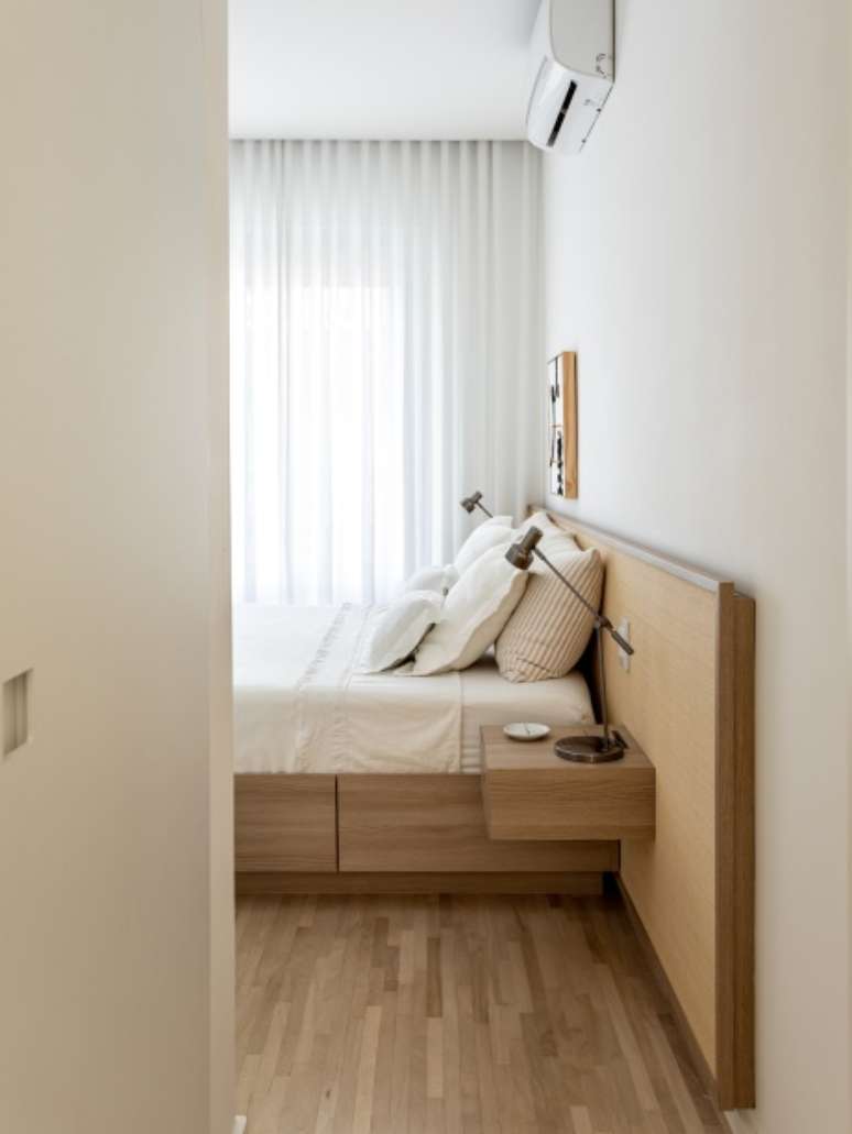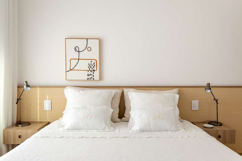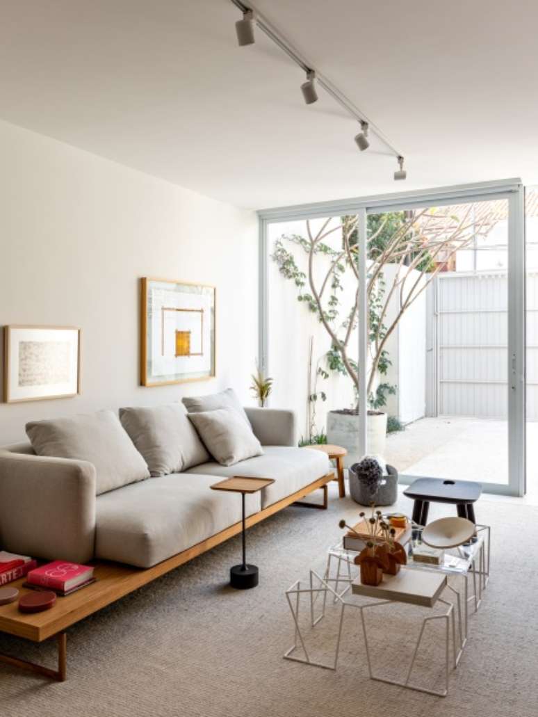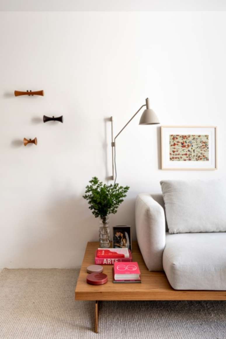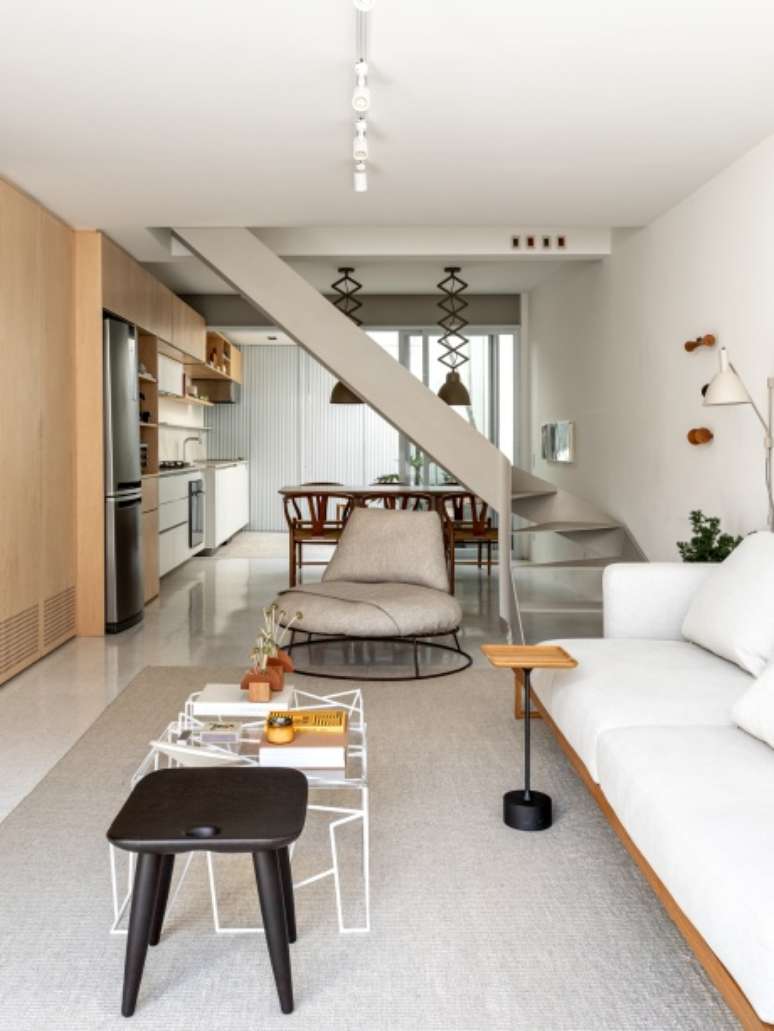 A decoração é minimalista, com poucos móveis e um décor mais limpo e leve. Cores amenas, na mesma paleta, fazem com que tudo esteja em sintonia sem agredir e nem ofuscar. Uma linha mais sóbria, com branco, cinza claro quente e madeira clara.