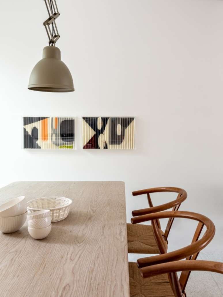 Como o espaço pode ser usado de diversas formas, na parte de iluminação o destaque fica com as luminárias da mesa de jantar, que são pantográficas de propósito para quando os moradores quiserem fazer alguma recepção um pouco maior. Eles podem girar a mesa e subir as luminárias para esse espaço ser totalmente utilizado.