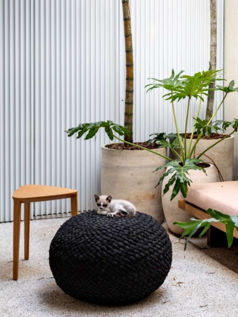 Já o painel metálico com ripas foi escolhido para mimetizar todas as portas do projeto - tanto a da entrada como as da lavanderia e a do lavabo. Vigas e escada metálicas foram aplicadas na mesma tonalidade para demarcar a importância de toda a alteração estrutural.