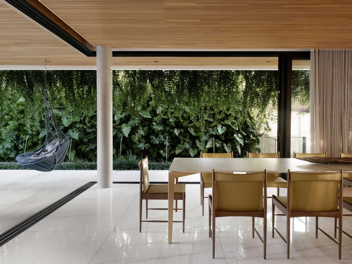 No geral, o projeto buscou criar uma casa contemporânea imponente, mas visualmente leve, totalmente integrada ao jardim e, para isso, o arquiteto não economizou em elementos naturais, como pedra, madeira e o verde da natureza. As portas-camarão de madeira ripada na fachada do segundo e terceiro pavimentos funcionam como brises que, além de oferecer privacidade aos moradores, ajudam a aplacar o sol escaldante na parte da tarde.