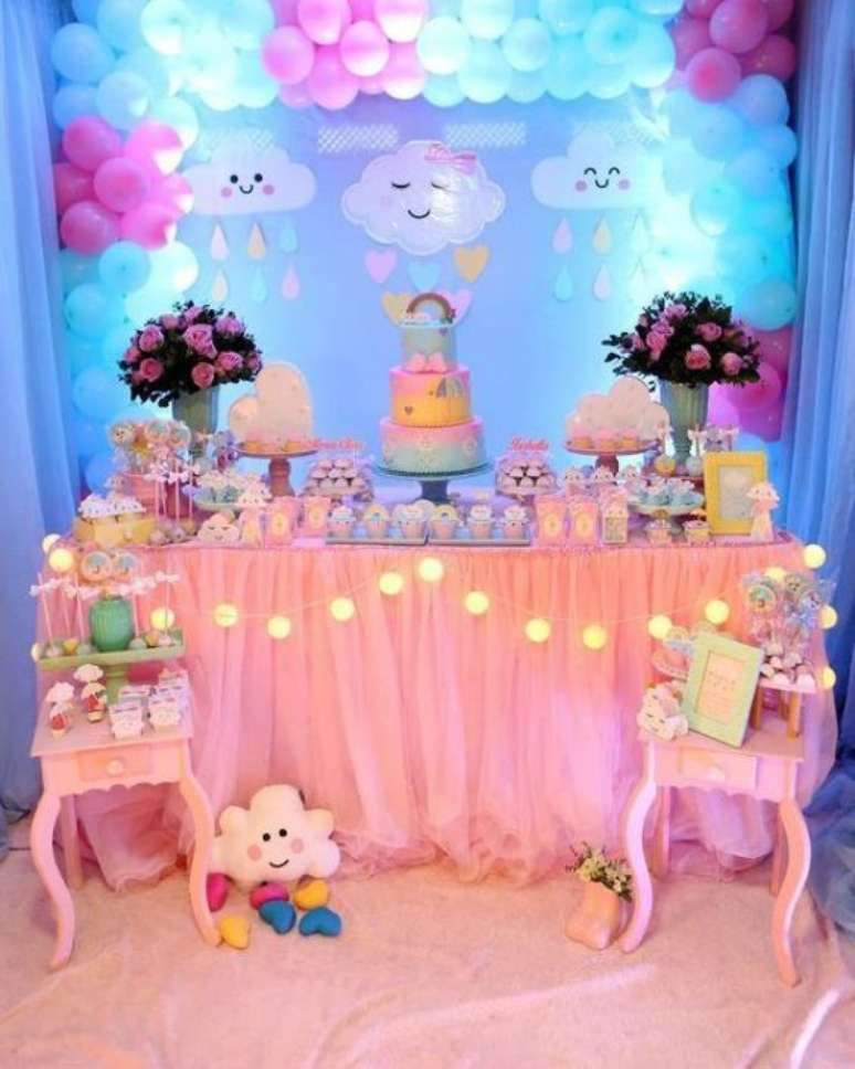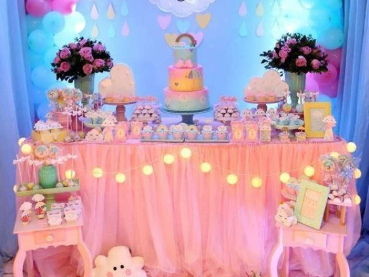 Aqui a decoração de aniversário chuva de benção pode contar com docinhos personalizados, balões em tons pastéis por todo ambiente, uma bela toalha branca para criar uma base mais neutra para mesa do bolo chuva de benção que também pode ter luminária em formato de nuvem e de gota d'água, suporte para doces e bolos em cores pastéis e assim por diante.