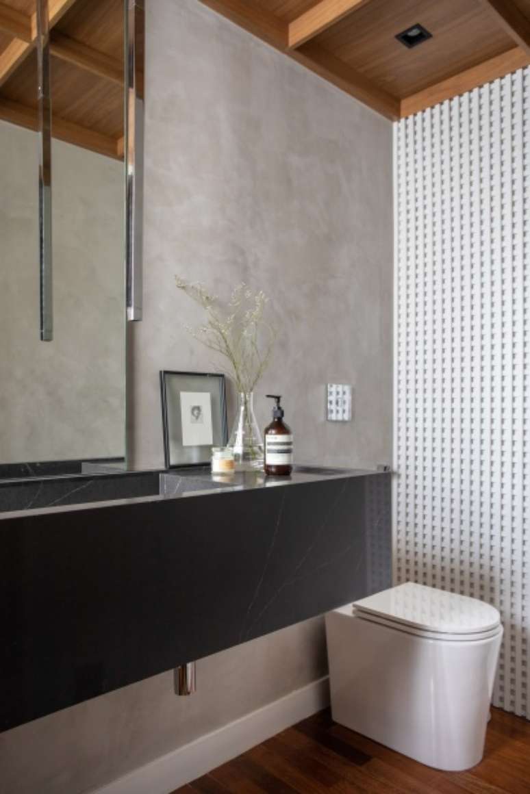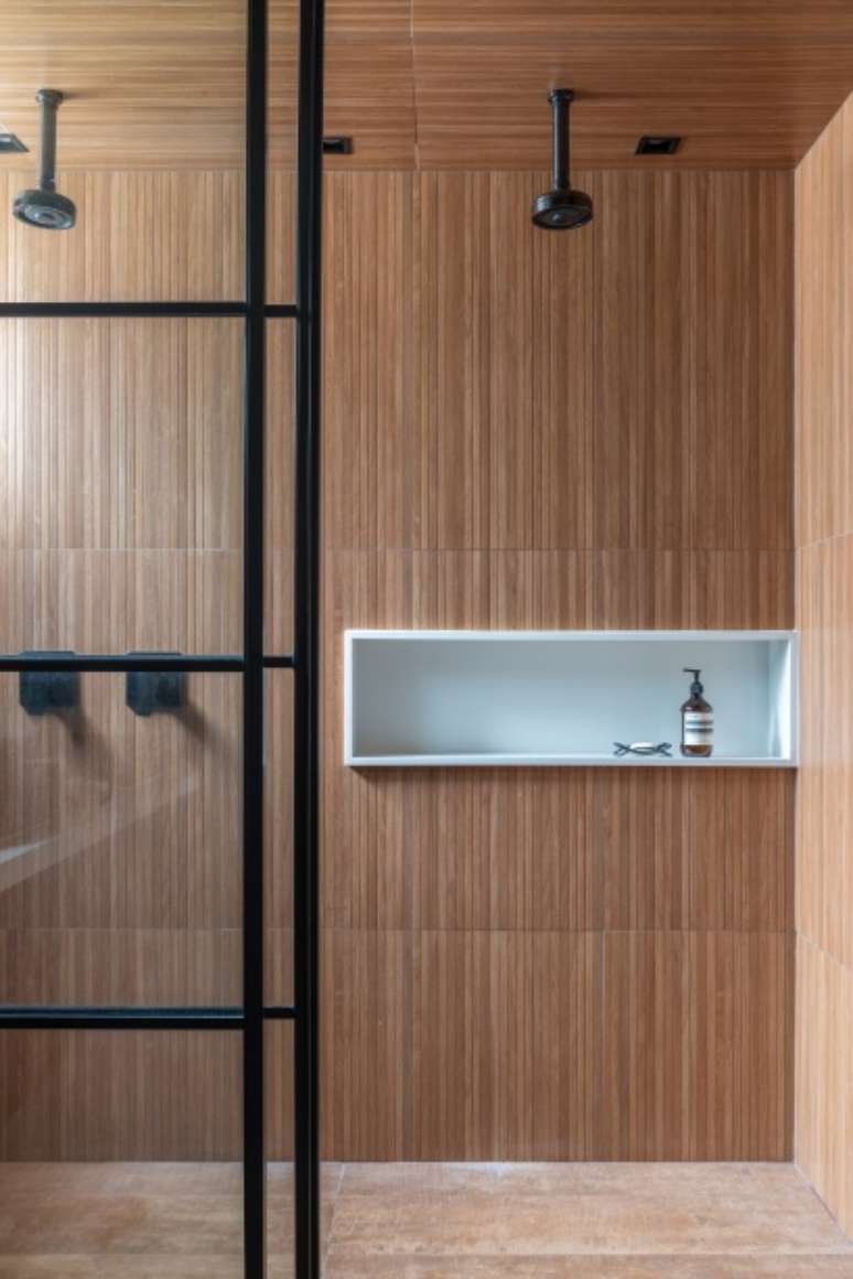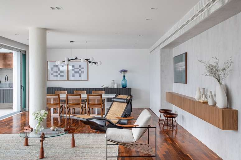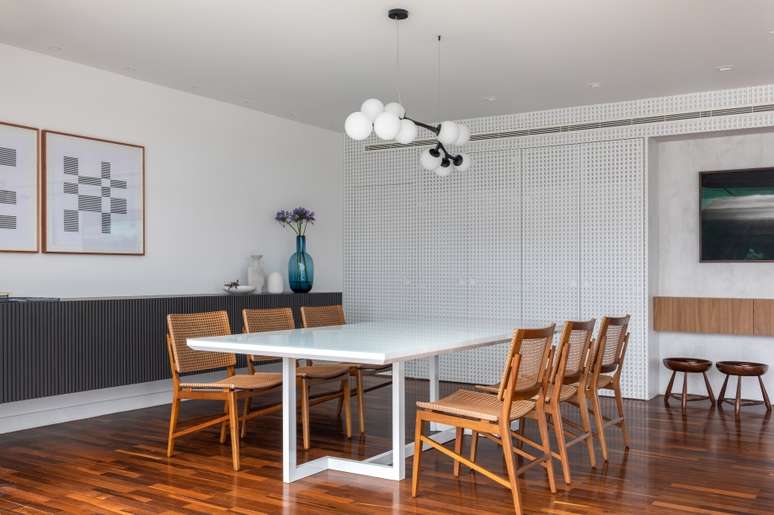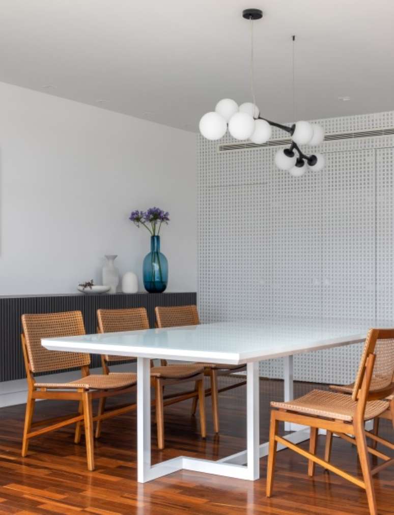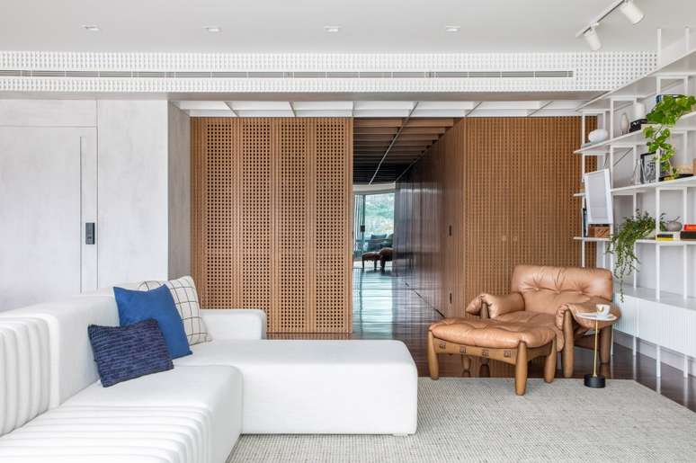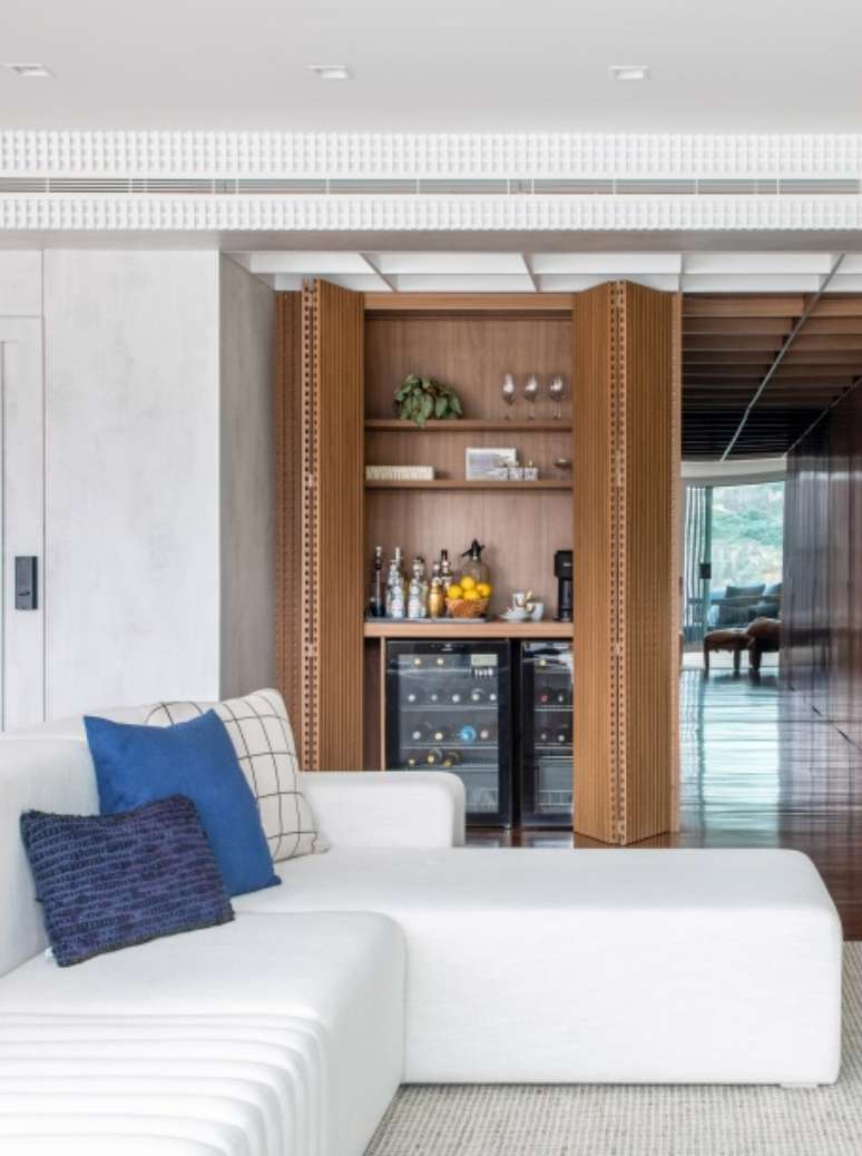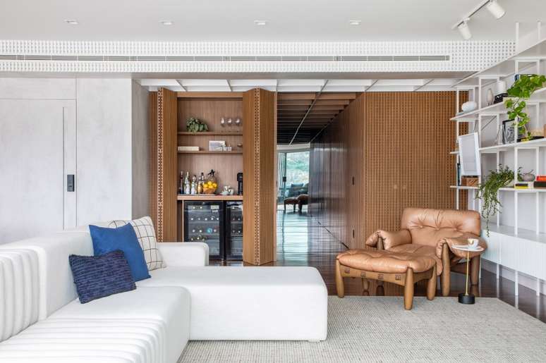 Repare ainda no grande pórtico de muxarabi branco que cruza toda a extensão das salas - desde o acesso à cozinha, passando pelo acesso social e chegando à circulação que conduz à área íntima, ladeada por um armário de madeira natural, com portas tipo camarão que camuflam o bar e a adega.