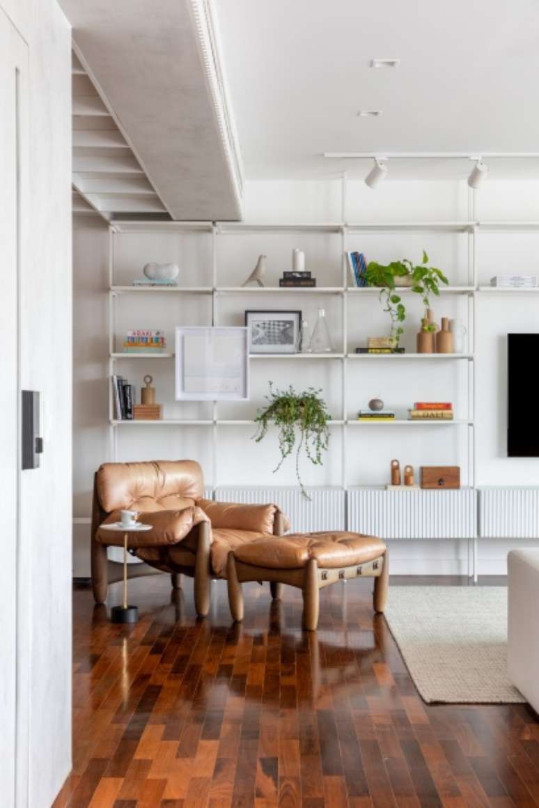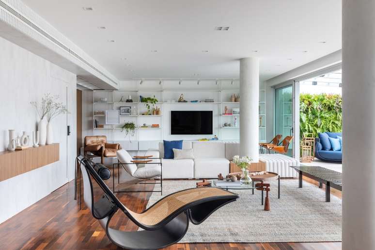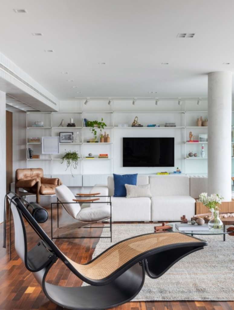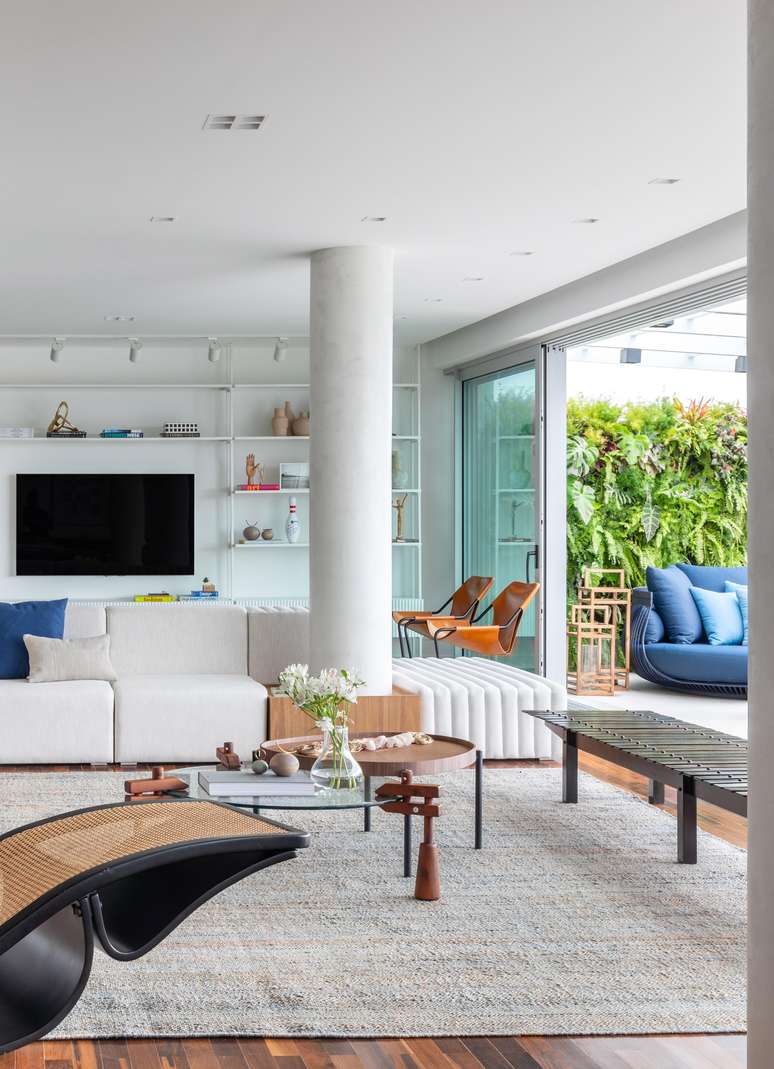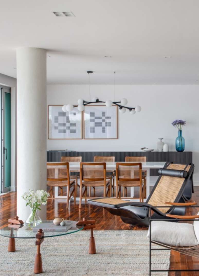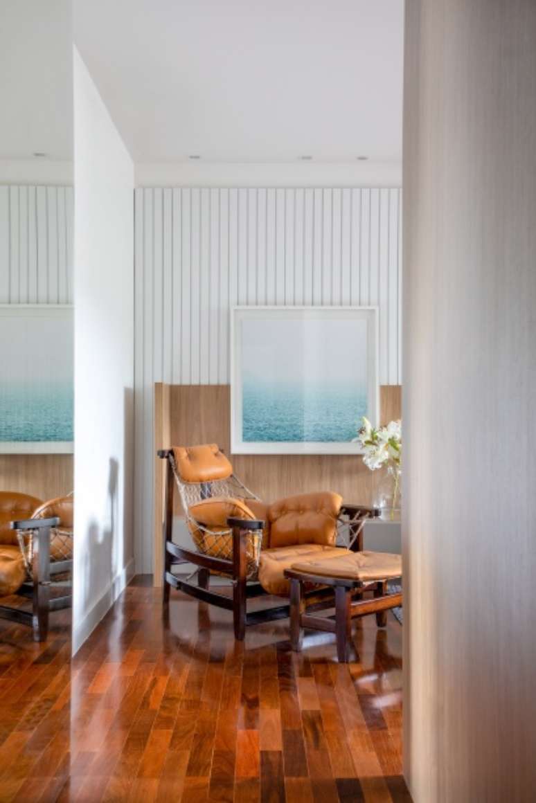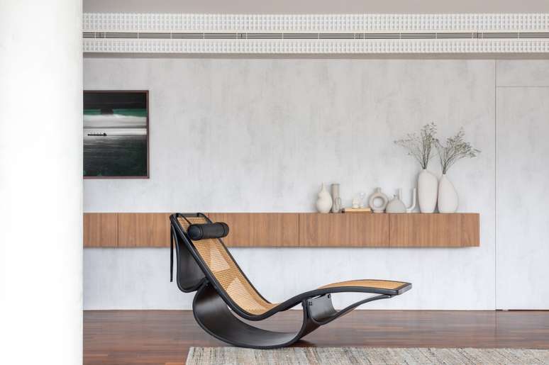 Na decoração, alguns móveis brasileiros de design assinado foram aproveitados do acervo dos clientes (trazidos do apartamento anterior, em São Paulo), a exemplo da poltrona Mole, de Sergio Rodrigues.