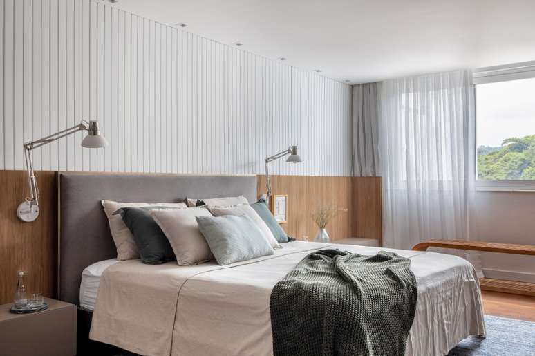 Outra intervenção pontual que surtiu grande efeito na valorização da vista foi a mudança no acesso principal ao apartamento, antes pela lateral da sala de estar, e agora mais ao centro, pela sala de estar. Já na área íntima, as intervenções na estrutura física foram pontuais para evitar uma obra mais prolongada.