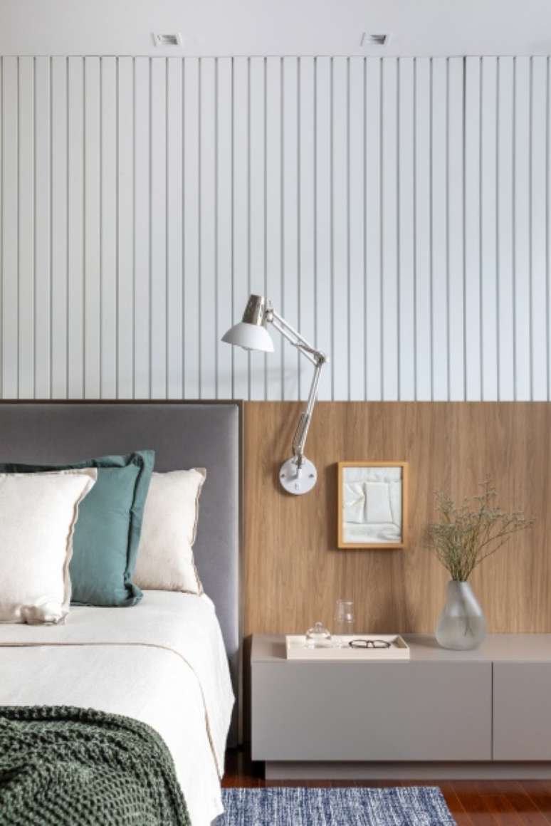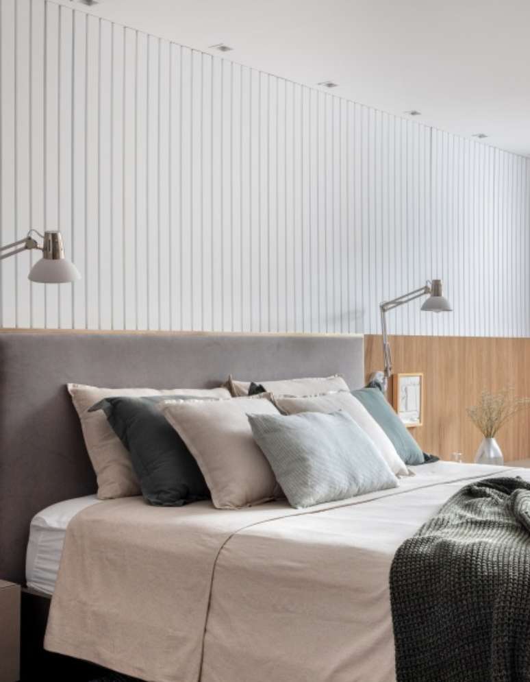 Paredes e teto brancos, pilares em concreto aparente bem claros e uma paleta que vai do bege ao cinza, em diferentes tons, dialogam com o piso existente, em tacos de peroba-do-campo, complementado nos pontos onde houve demolição e estendido por toda a circulação e a área íntima. Já os tons mais escuros aparecem em algumas peças de mobiliário para criar pontos de contraste.
