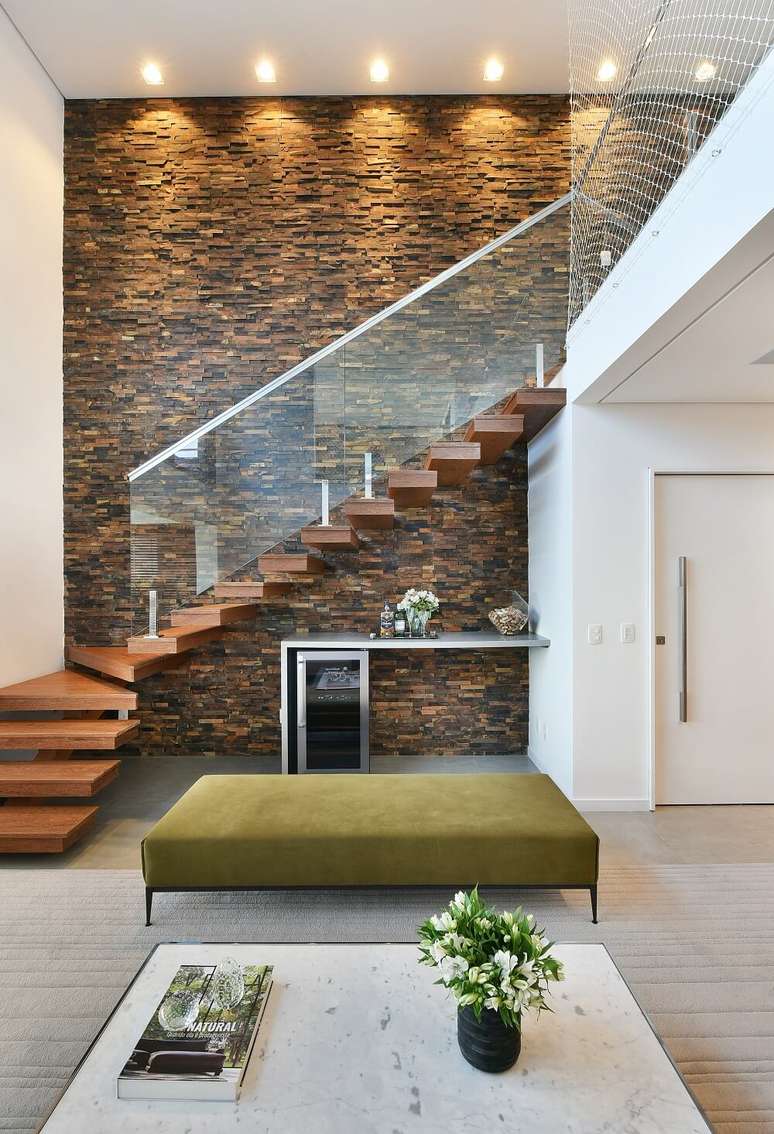 Com o objetivo de valorizar o pé direito duplo do ambiente, as arquitetas Marina Salomão e Carol Multini decidiram revestir toda a parede da escada flutuante de madeira com pedra. O guarda corpo de vidro trouxe leveza e um toque moderno ao espaço.