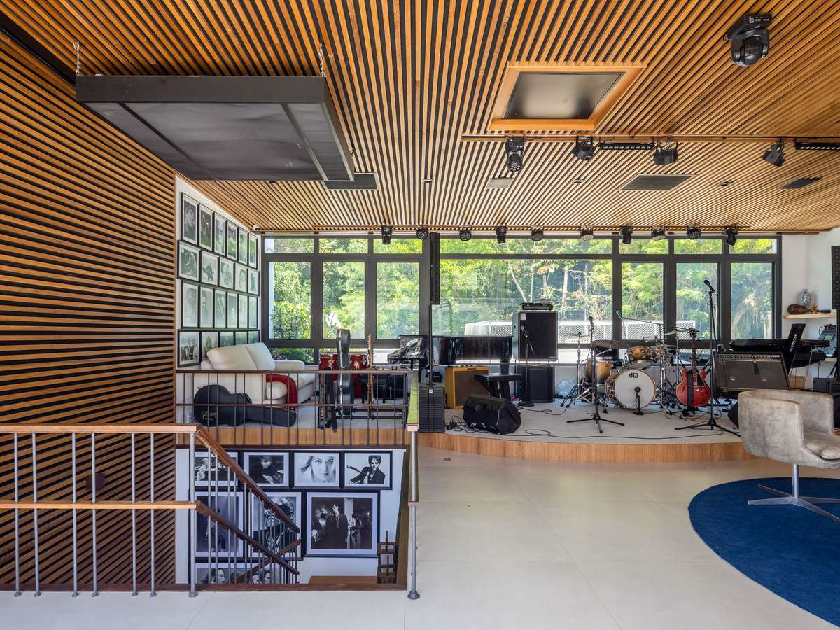 O apartamento de mais de mil metros quadrados passou por uma longa reforma tocada pelo arquiteto Maurício Nóbrega. Além de todo o tratamento acústico necessário, o estúdio ganhou projeto luminotécnico de Maneco Quinderé que fez para o espaço uma luz de palco. Afinal, não são poucos os músicos - profissionais ou não, famosos ou nem tanto - que costumam frequentar o espaço.