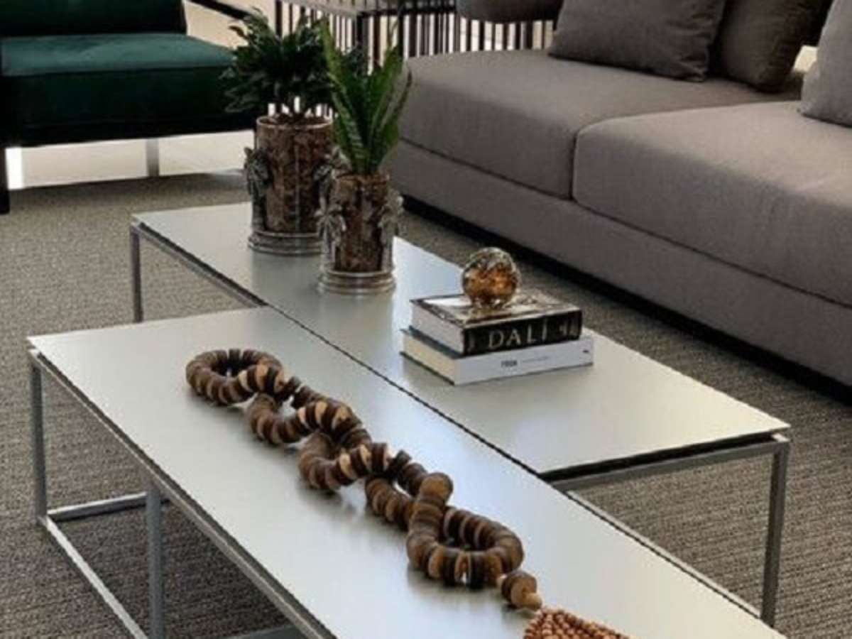 Contudo, nada impede do colar de mesa também ser usado em outros móveis pela casa como cômoda, aparador, buffet, rack, mesa de centro e mesa lateral, como mostra a imagem abaixo. Observe que o colar de mesa decorativo forma uma linda composição juntos aos livros e vaso de planta.