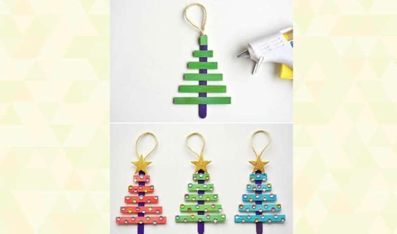 Para fazer esse enfeite fofo de árvore, você precisará de apenas alguns palitos de sorvete e muita criatividade! Basta cortá-los em diferentes tamanhos e colar no formato certo. Depois, é só pintar e decorar como desejar.