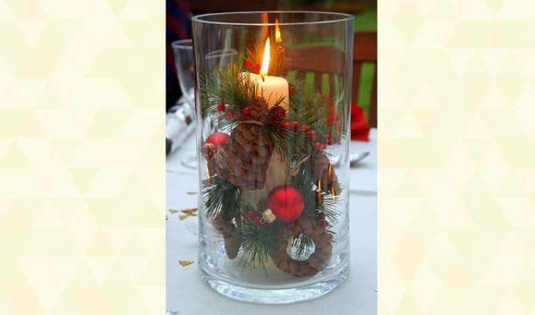 Para a mesa de jantar, uma ótima ideia é enfeitar uma vela dentro de um copo com o que sobrou da sua árvore. Dessa forma, você garante uma decoração simples e elegante, que dará um toque especial para a sua ceia.