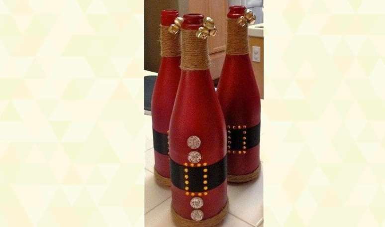 Também é possível decorar as garrafas de vinho e champanhe em casa para o Natal. É só encapá-las com tecidos ou pintá-las com tinta colorida, colocando depois um pouco de brilho para fazer os detalhes.