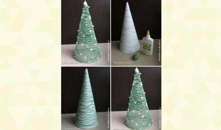 Outra forma de decorar a casa no Natal, que ainda pode ser feita pelas crianças, é essa linda árvore de barbante. Tudo que você precisa é enrolar a linha verde, com a ajuda da cola branca, em torno de um cone de papel. Depois é só retirá-lo!