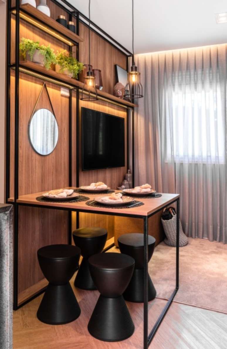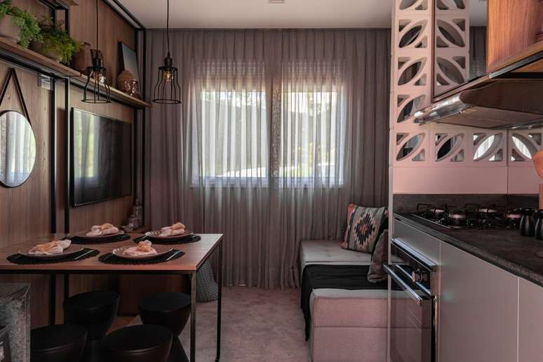 Para dar mais aconchego, tapete e almofadas reforçam a sensação de conforto, pois mesmo com espaço otimizado, o local é perfeito para o entretenimento em família. Com o intuito de ampliar a percepção de amplitude, o recurso dos espelhos foi adicionado próximo à mesa, e na parede que recebe as costas do sofá.